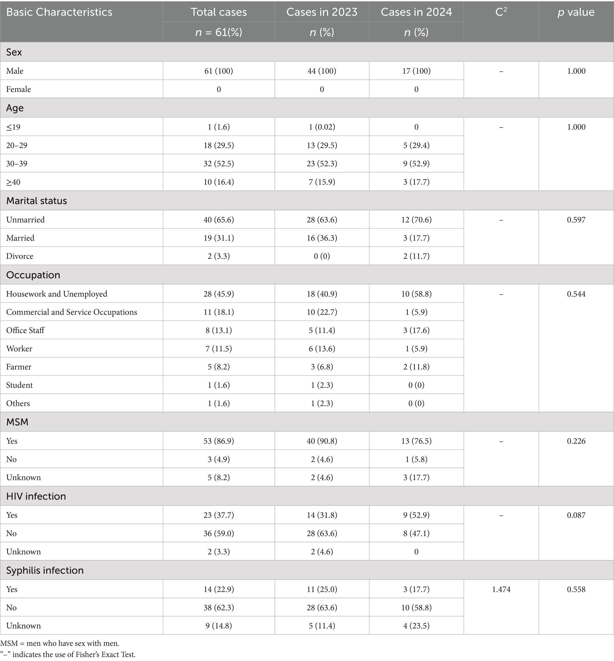 Characteristics of the reported Mpox cases in Shandong Province, 2023–2024