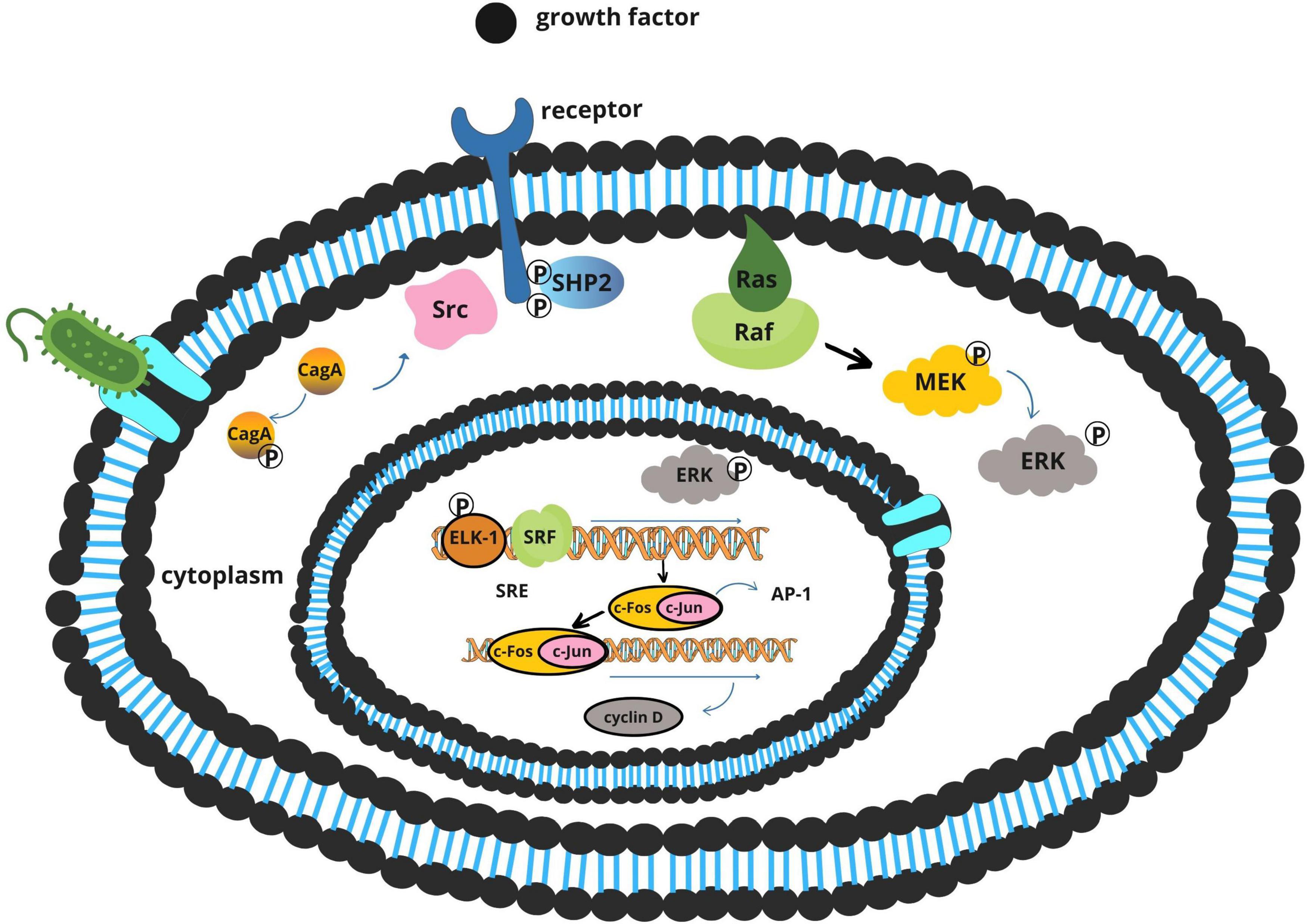Once translocated, CagA is phosphorylated by host Src and Abl tyrosine kinases. The phosphorylated form interacts with SHP-2, a protein tyrosine phosphatase that activates the Ras–ERK signaling cascade (Figure 4). This results in increased cell proliferation, morphological transformation, and disruption of cellular polarity (Alipour, 2021; Tsutsumi et al., 2003).