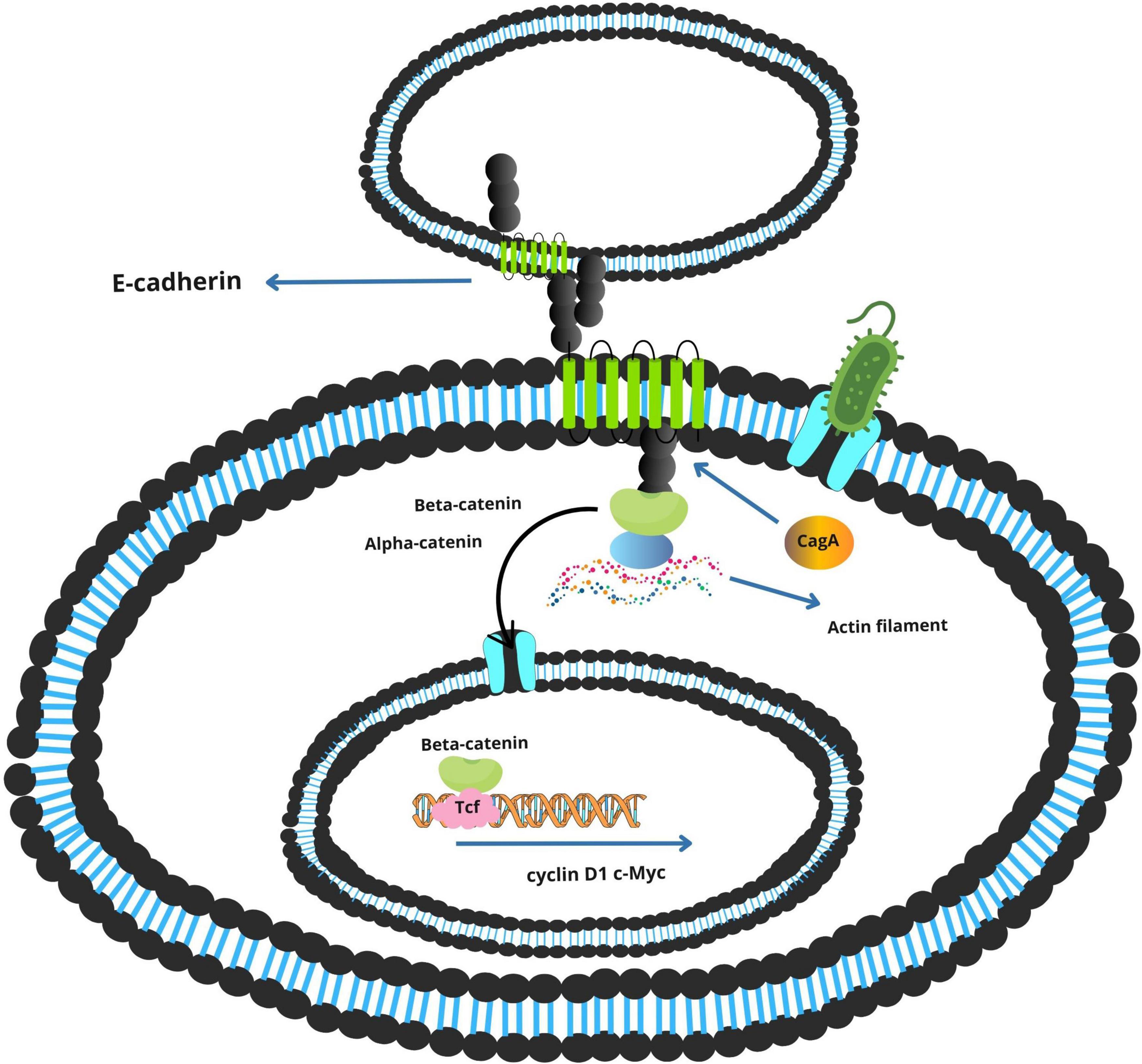 Simultaneously, the non-phosphorylated form of CagA perturbs adherens junctions by binding to E-cadherin, destabilizing the β-catenin complex (Figure 5). Released β-catenin translocates into the nucleus, where it activates Wnt target genes such as cyclin D1 and c-Myc, promoting uncontrolled cellular proliferation (Jones et al., 2010; Wang H. et al., 2023).