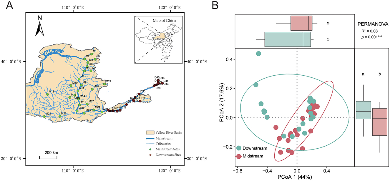 Figure 1. (A) The location of Yellow River Basin and distribution of sampling sites. (B) The results of PCoA, ANOVA of PCoA1 and PCoA2, and PERMANOVA significance based on the Euclidean distance of factors. Different letters indicate significant differences. ***p = 0.001.