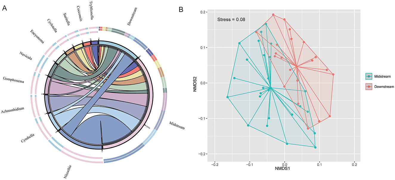 Figure 2. (A) Chord diagram showing the distribution of dominant benthic diatom genera between the middle reaches and lower reaches Yellow River. (B) NMDS ordination plot illustrating distinct diatom community structures between the two regions (stress = 0.08).
