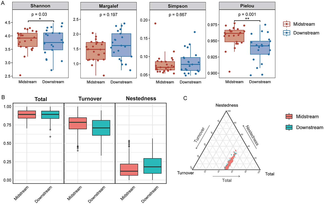 Figure 3. Diversity analysis of benthic diatom communities in the middle and lower reaches of the Yellow River. (A) Boxplots of α diversity indices for middle reaches and lower reaches regions. (B) Boxplots of β diversity components for both regions. (C) Ternary plot visualizing the relative contributions of turnover (species replacement between sites), nestedness (species loss or subset patterns), and total beta diversity across all samples in the middle and lower reaches of the Yellow River. *p < 0.05, **p < 0.01.