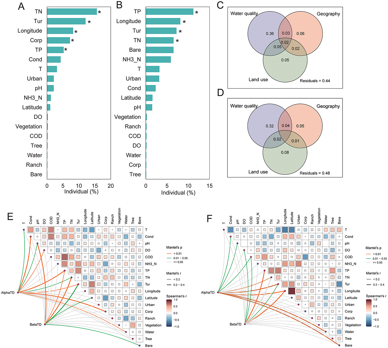 Figure 4. Key environmental and spatial drivers of benthic diatom diversity in the middle (A) and lower (B) reaches of the Yellow River. Contributions of environmental, geographical, and land use variables to alpha and beta diversity, where turnover refers to species replacement and nestedness indicates species loss or subset patterns. Variance partitioning for middle (C) and lower (D) reaches illustrates their relative explanatory power. Correlation and Mantel test results (E, F) show relationships between diversity and variables. *p < 0.05.