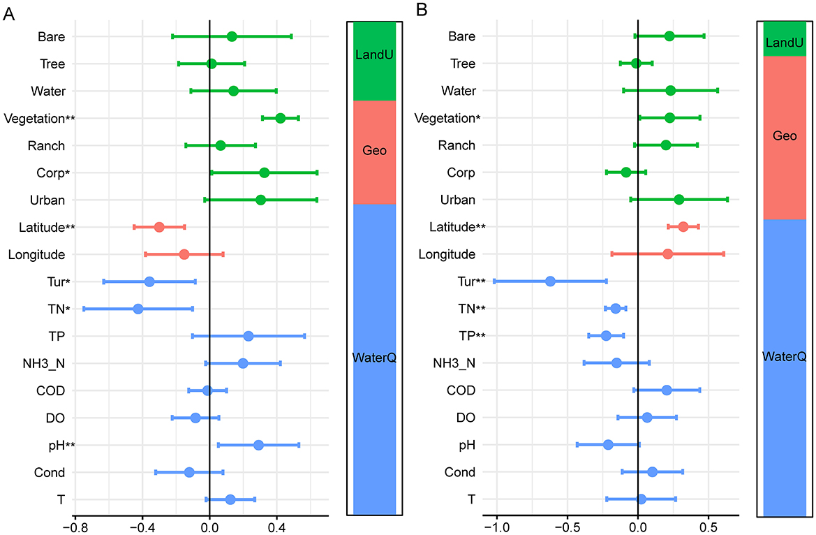 The regression analysis and variance partitioning further clarified the contributions of individual predictors and variable categories (water quality, geography, and land use) to diatom diversity (Figure 5). The results of the analysis demonstrate differences in the key drivers of benthic diatom communities between middle reaches (Figure 5A) and lower reaches (Figure 5B) regions. In the middle reaches region, water quality factors such as turbidity (Tur), total nitrogen (TN), and total phosphorus (TP) were the primary contributors, with significant positive and negative associations (p < 0.05), indicating their strong influence on diatom community composition. Geographical factors, such as latitude, also had a significant impact, though to a lesser extent, while land-use factors, including vegetation and corporate land, were moderately influential. The variance partitioning analysis revealed that water quality accounted for the largest proportion of explained variation, followed by land use and geography. In the lower reaches region, the influence of water quality factors remained dominant, with TP, TN, and Turbidity showing highly significant effects (p < 0.01). However, the contribution of land-use factors, including vegetation, became more prominent, reflecting the increasing role of anthropogenic influences in this region. Geographical factors, particularly latitude, maintained a significant, albeit smaller, effect compared to middle reaches. The variance partitioning analysis showed a consistent dominance of water quality in explaining diatom community variation, though the role of land use increased lower reaches, highlighting spatial and environmental variability between the two regions.