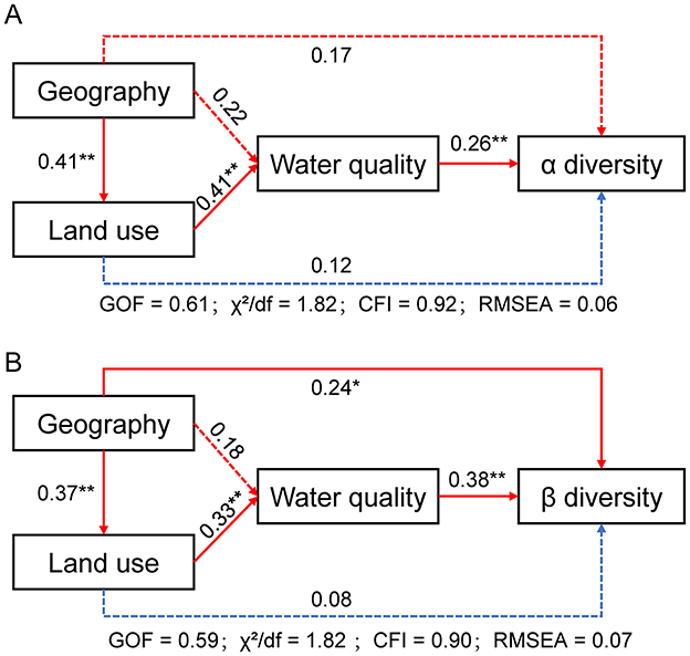 Figure 6. Structural equation models (SEMs) for Yellow River basin based on the relationship between geography, land use and water quality and diversity. Solid lines indicate significant paths (*p < 0.05, **p < 0.01, ***p < 0.001); dotted lines mean non-significant paths. Orange lines show positive path strengths and blue lines represent negative path strengths. (A) Alpha diversity; (B) Beta diversity.