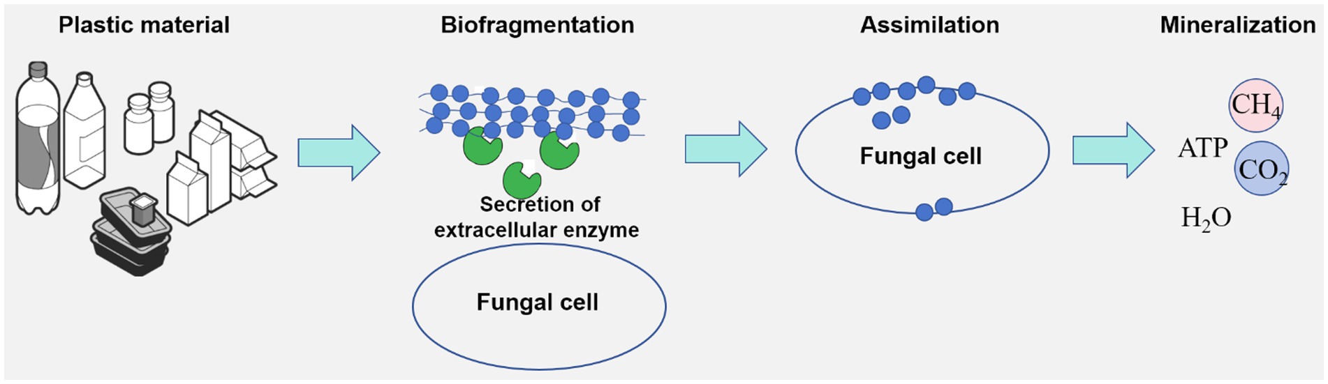 Fungi play a pivotal role in the degradation and assimilation of various plastic materials (Figure 1), including polyethylene, polystyrene, and polyvinyl chloride (Maity et al., 2021; Cowan et al., 2022; Vaksmaa et al., 2023). Certain fungal species have demonstrated the remarkable capacity to degrade specific plastics within a matter of days, highlighting their potential for addressing plastic pollution (Okal et al., 2023).