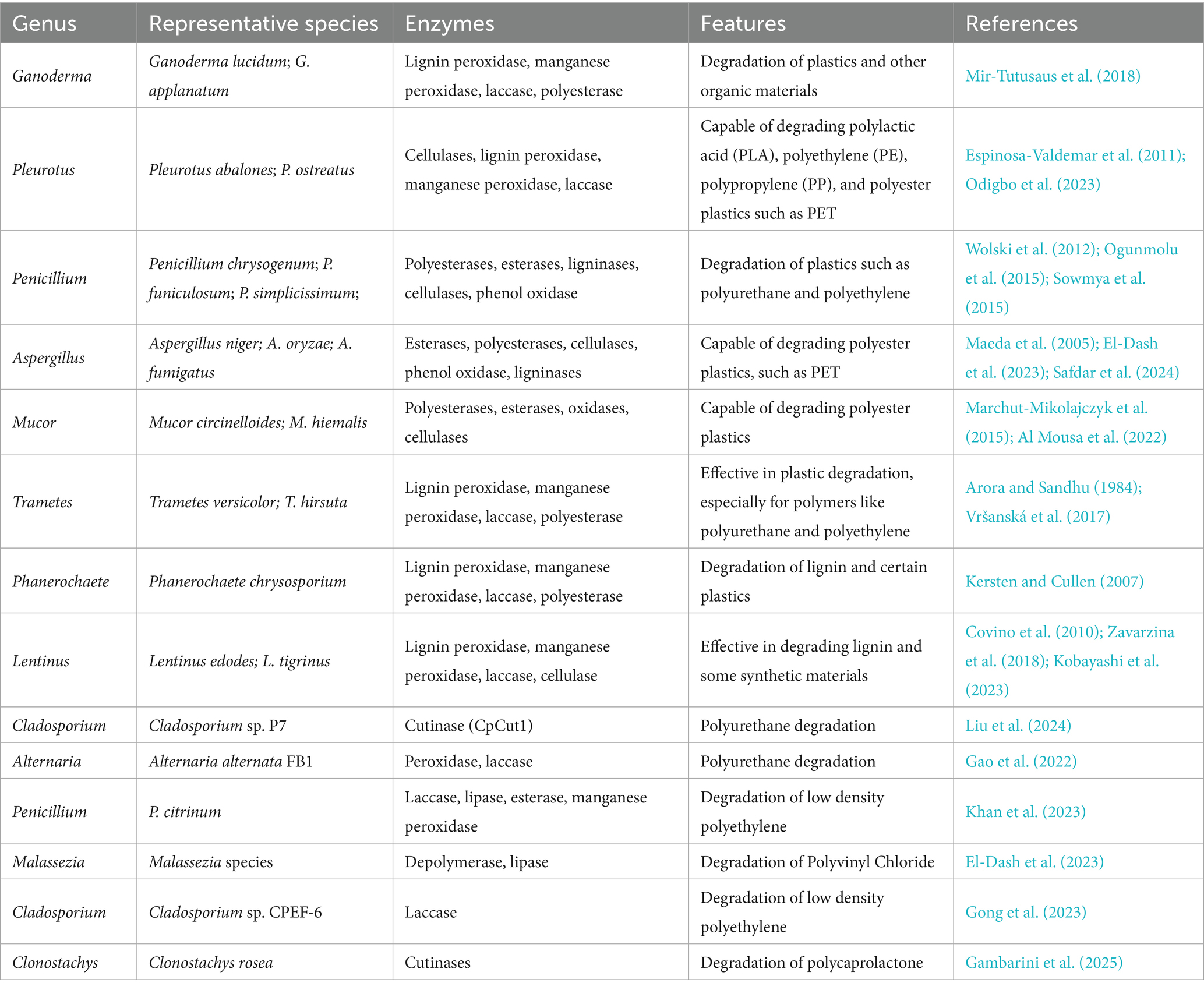 Fungi exhibit remarkable adaptability, enabling them to utilize nearly any organic carbon source and thrive in conditions characterized by low humidity, nutrient scarcity, and acidic pH levels (Case et al., 2025). Some species can endure dry periods through a state of cryptobiosis (Magan, 2007; Mancera-López et al., 2008). The metabolic pathways within fungi are mediated by cytochrome P450 (CYP) monooxygenases (EC:1.14.13.12), which facilitate the oxidation of substrates in microsomes (Durairaj et al., 2015; Asemoloye et al., 2019). These enzymes belong to the heme-protein superfamily and are involved in various biological processes, including adaptation to environmental stress, toxin production, and the metabolism of both endogenous and xenobiotic compounds, thereby enhancing fungal fitness (Bernhardt, 2006; Van Beilen and Funhoff, 2007; Kelly et al., 2009; Moktali et al., 2012). CYP monooxygenases typically function as terminal oxidases in the electron transfer chain associated with NADPH reductase, facilitating the incorporation of an oxygen atom into the hydrocarbon chain of nanoplastics while reducing the other oxygen atom to water (Chen et al., 2014). The number of CYP genes varies according to the lifestyle of the fungal species; yeasts and yeast-like fungi possess relatively few CYPs (e.g., three in Saccharomyces cerevisiae, six in C. neoformans, and 10 in C. albicans), while filamentous fungi typically harbor a greater number of CYP genes, as exemplified by Aspergillus spp. with 79 genes and Agaricus bisporus with 109 (Doddapaneni et al., 2013; Dauda et al., 2022). As a result, plastic-degrading fungi are predominantly filamentous species (Table 1), including Ganoderma lucidum, Pleurotus abalone, Penicillium chrysogenum, and Aspergillus niger (Wolski et al., 2012; Mir-Tutusaus et al., 2018; Odigbo et al., 2023; Safdar et al., 2024). Ekanayaka et al. assessed 395 filamentous fungal strains from the Ascomycota and Basidiomycota phyla, identifying over 200 species capable of degrading various plastics under diverse environmental conditions (Ekanayaka et al., 2022). Their findings revealed that fungi such as Aspergillus tubingensis effectively disrupt the chemical bonds within plastic molecules and successfully colonize plastic surfaces (Ekanayaka et al., 2022). Numerous plastic-degrading fungi have been isolated from both terrestrial and marine environments (Viel et al., 2023), including Trichoderma sp., Clitocybe sp., Monascus sp., and Phanerochaete sp., which enhance the degradation of polyethylene (both LDPE and HDPE), polylactic acid, polyurethanes, polyethylene terephthalate, and bisphenol A polycarbonate (Artham and Doble, 2010; El-Morsy et al., 2017; Ojha et al., 2017; Satti et al., 2017; Janczak et al., 2018; Munir et al., 2018). Marine environments have yielded marine yeasts such as Rhodotorula mucilaginosa, Zalerion maritimum, Alternaria alternata, Penicillium spp., and Aspergillus sp., which significantly facilitate the degradation of polyethylene and polystyrene, contributing to healthier ecosystems by reducing plastic waste (Ameen et al., 2015; Sarkhel et al., 2020; Gao et al., 2022; Vaksmaa et al., 2023; do Paço, A.M.S., 2024). Overall, the capacity of fungi to degrade plastics presents a promising avenue for bioremediation strategies aimed at mitigating the environmental impacts of plastic waste. Advances in the exploration of fungal enzymes, along with genetic engineering techniques, could enhance biodegradation processes and contribute to sustainable waste management practices.