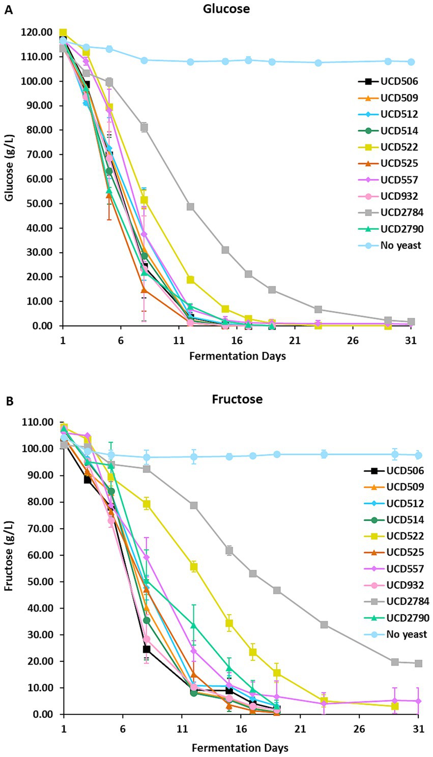 Figure 1. Alcoholic fermentation in the synthetic juice. Glucose (A) and fructose (B) concentrations were measured over 31 days of fermentation using 10 different S. cerevisiae strains and a “No yeast” control. Data points represent the mean of three independent biological replicates, and error bars indicate standard deviations.