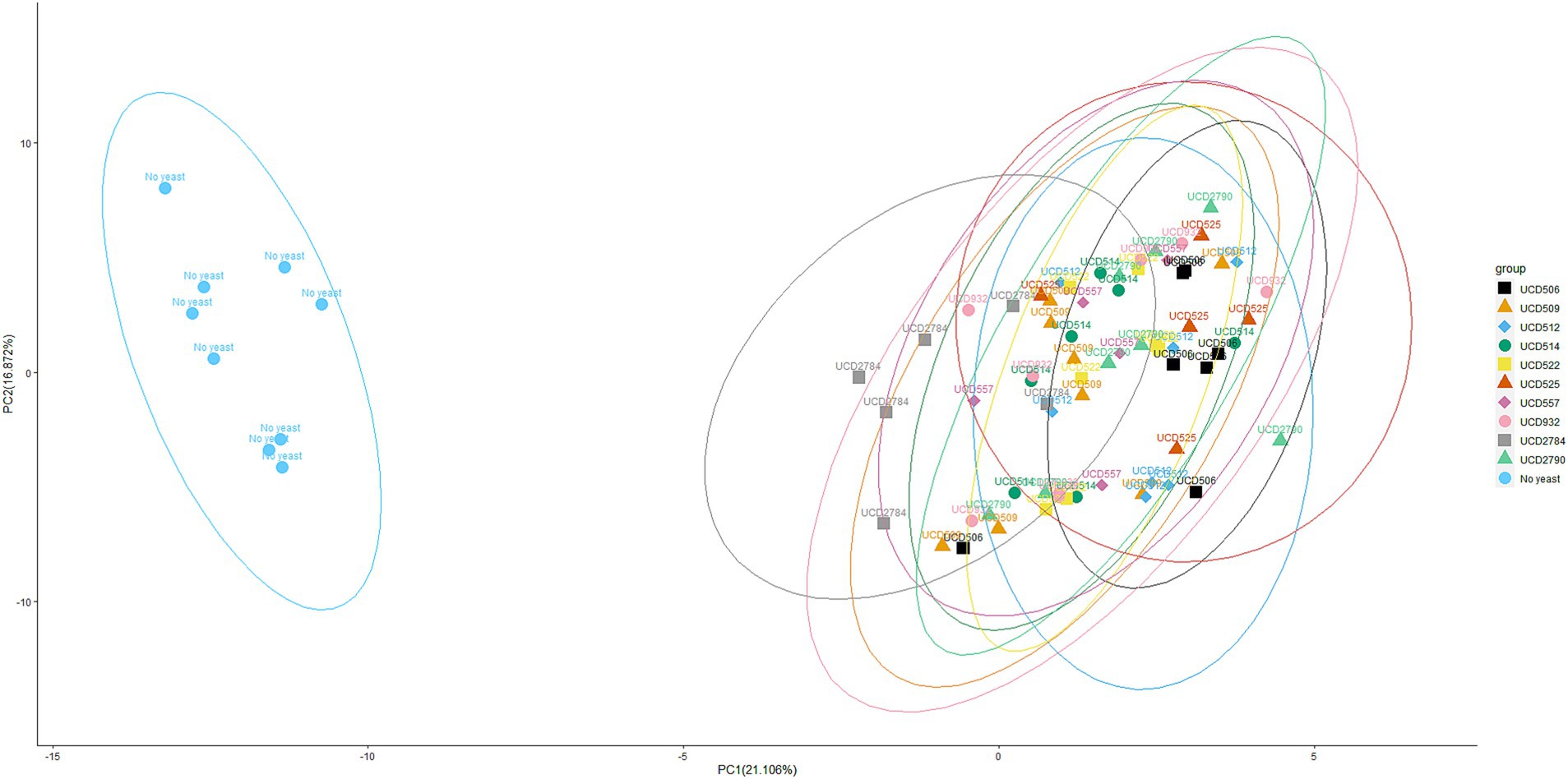 Figure 2. Principal component analysis (PCA) of glycoside profiles from mini-scale alcoholic fermentation. PCA plot showing the distribution of glycoside profiles obtained after fermentation with 10 different S. cerevisiae strains and a “No yeast” control. Each point represents both biological and technical replicates. Each point represents both biological and technical replicates. For each strain, 9 samples were analyzed in total: 3 independent biological replicates, each prepared in triplicate as technical repeats, to minimize variability from HPLC instrument runs. Datasets producing inconsistent results were excluded, and only “clean” data were retained for PCA analysis. Data are projected onto the first two principal components, with the percentage of total variance explained by each component indicated on the respective axes. Ellipses represent the 95% confidence interval around the multivariate mean of each strain, providing a visual estimate of clustering and variability.