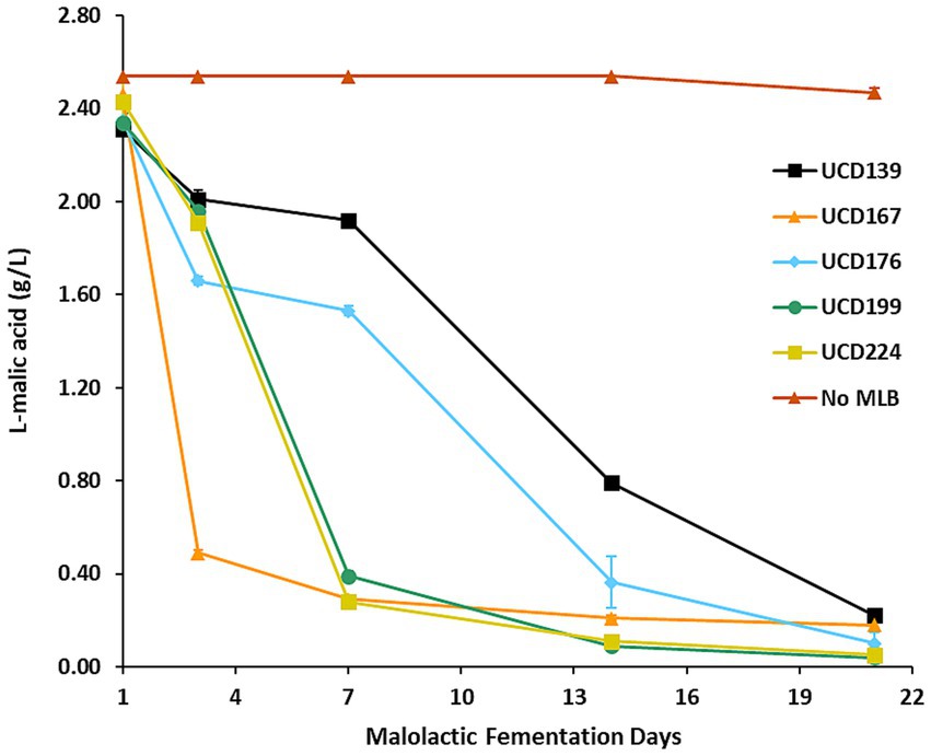 Figure 3. Malolactic fermentation in the synthetic wine. L-malic acid concentrations were measured over 21 days during malolactic fermentation carried out by 5 different O. oeni strains, with a “No MLB” (no bacteria) control included for comparison. Each data point represents the mean of 3 independent biological replicates, and error bars indicate standard deviations.