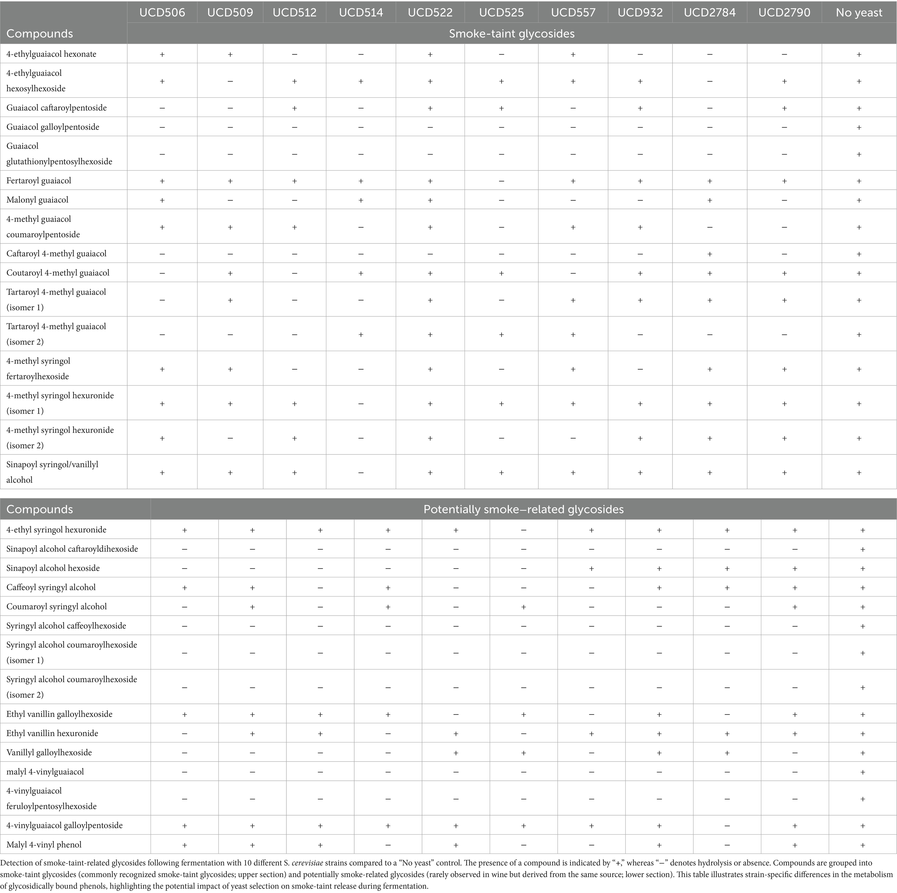 Our findings highlight the pivotal role of yeast and malolactic bacteria in modulating glycosidic compounds in wine, suggesting a biologically driven strategy to mitigate smoke-taint in wines produced from wildfire-exposed grapes. Notably, among the yeasts, strains UCD514 and UCD525 hydrolyzed the greatest number of glycoside compounds (21 out of 93 observed, Supplementary Table S3), while among the bacteria, strain UCD199 hydrolyzed the highest number (16 out of 29 observed, Supplementary Table S5). The robust hydrolytic activity of these strains emphasizes their potential for targeted application in precision fermentation approaches. These results broaden previous research demonstrating strain-specific variability in β-glucosidase activity and its impact on volatile aroma release (Whitmore et al., 2021). Moreover, yeast and bacterial glycosidases exhibit substrate specificity. In this study, two glycosides, 4-methyl guaiacol galloylhexoside and 4-vinyl catechol galloylhexoside, were detected during both yeast alcoholic fermentation and bacterial malolactic fermentation (Supplementary Tables S4, S6). Neither glycoside was hydrolyzed by any tested S. cerevisiae strains, whereas both were hydrolyzed by most of the tested O. oeni strains (Table 2). These findings emphasize that, in wine studies, the contributions of both yeast and bacteria must be considered when evaluating flavor evolution.
