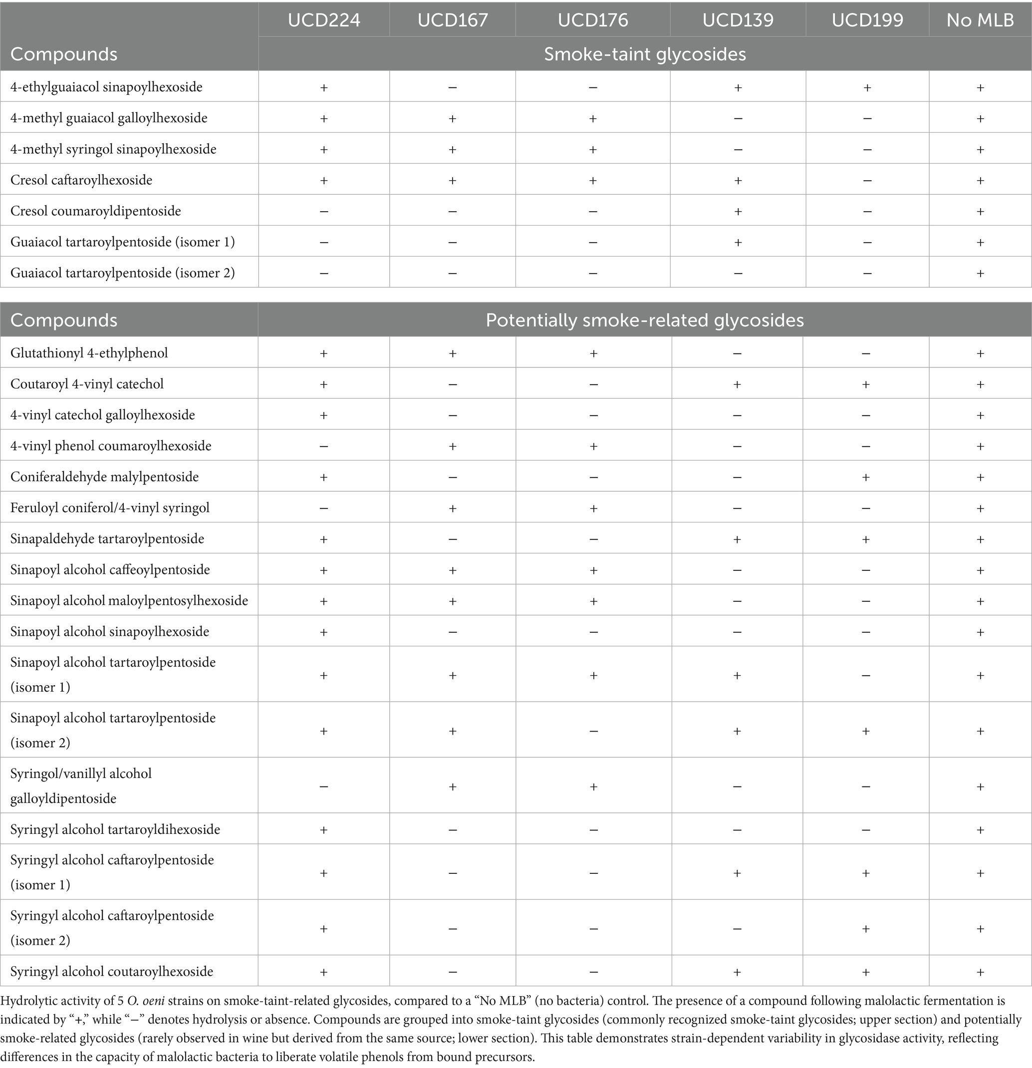 Although only a limited number of glycosides were detected under mini-scale malolactic fermentation conditions, these findings suggest that glycosidase activity in O. oeni is both strain-dependent and compound-specific, with potential implications for the targeted modulation of smoke-taint precursors during malolactic fermentation.
