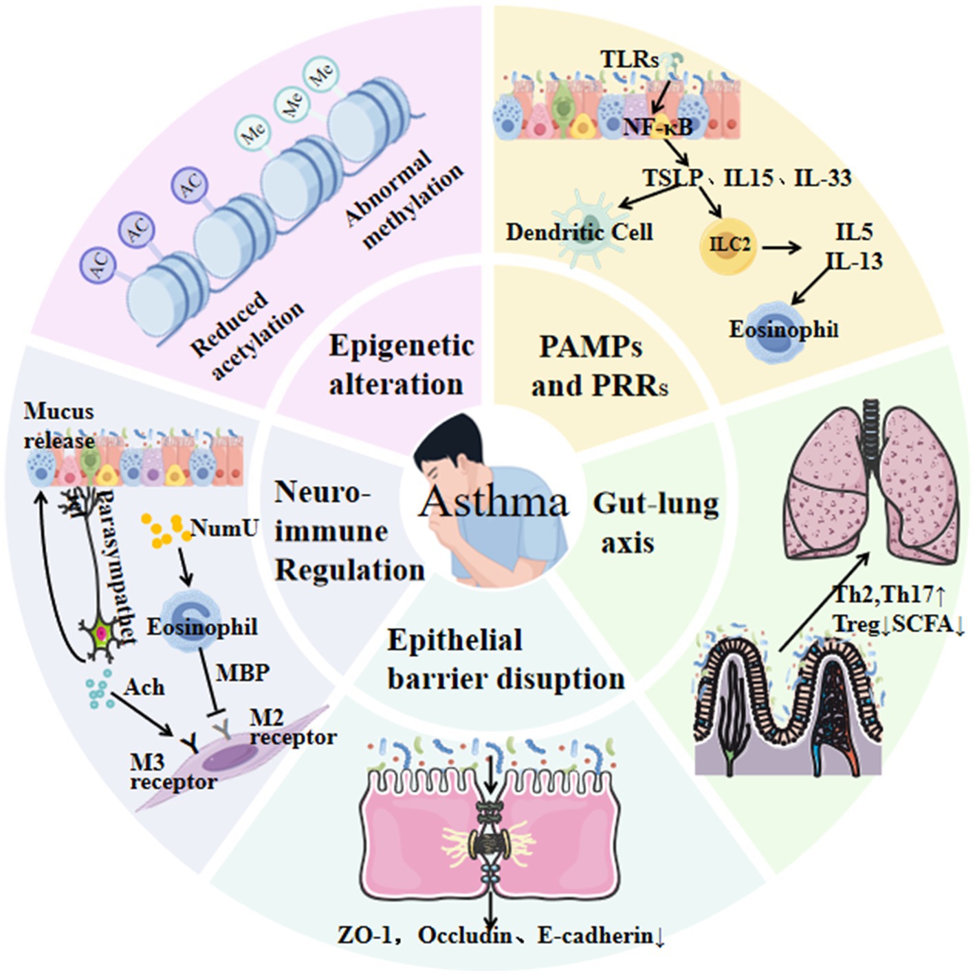 The development and progression of asthma are shaped by intricate host–microbe interactions, which influence immune maturation, epithelial barrier integrity, and inflammatory responses. Early conceptual frameworks, such as the hygiene hypothesis, proposed that reduced exposure to pathogens during early childhood impairs immune tolerance and increases the risk of allergic diseases. This idea has since evolved into the biodiversity hypothesis, which emphasizes that limited contact with diverse natural environments and environmental microbiota diminishes immune regulatory capacity and heightens susceptibility to asthma and other allergic disorders (Haahtela et al., 2013). Supporting this view, decreased diversity of commensal taxa—including Lactobacillus, Bifidobacterium, and Bacteroides—has been associated with impaired induction of regulatory T (Treg) cells and disrupted immune homeostasis, ultimately enhancing vulnerability to airway inflammation. Current evidence indicates that the influence of the microbiota on asthma involves multiple, interconnected mechanisms that operate across different biological levels. These mechanisms encompass innate immune sensing through pattern recognition receptors (PRRs), modulation of epithelial barrier structure and function, epigenetic regulation, and neuro–immune signaling. Collectively, they can be broadly classified into primary drivers, intermediate modulators, and downstream immune effectors, reflecting the hierarchical organization of microbiota–host interactions in asthma. Figure 1 provides an integrative schematic of these pathways, illustrating how gut microbial communities act as upstream drivers, epithelial and epigenetic processes function as intermediate modulators, and neuro–immune interactions operate as downstream regulatory mechanisms. This framework contextualizes the subsequent sections within a unified model of asthma pathogenesis.