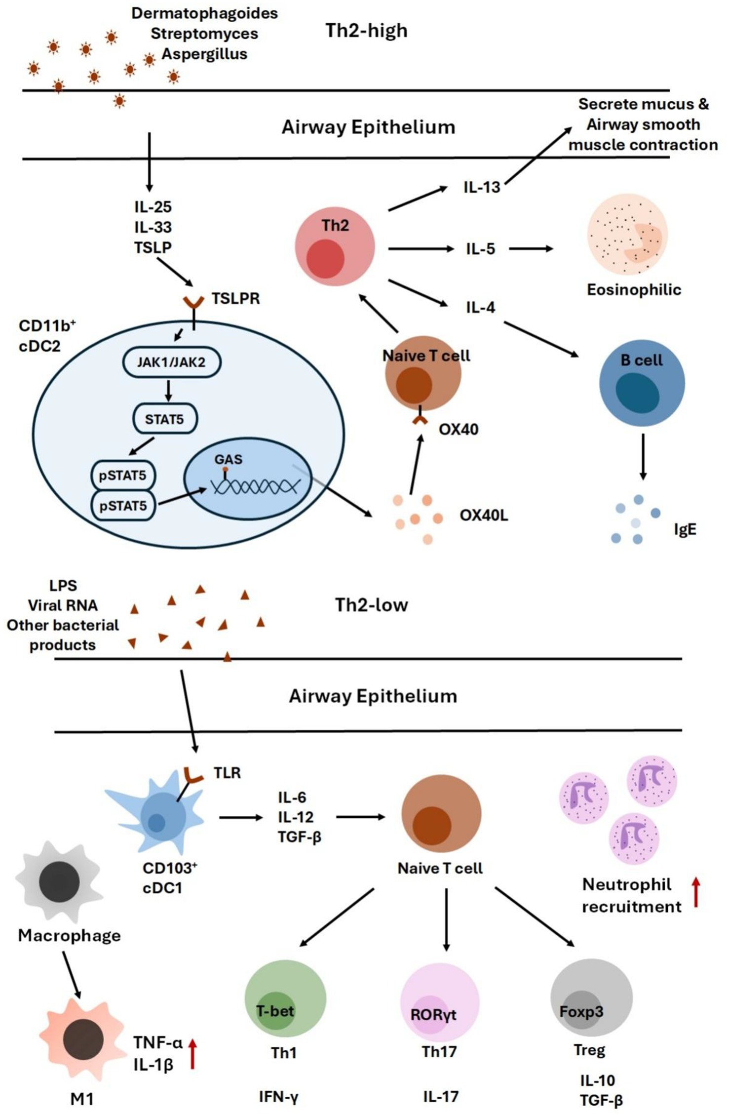 Figure 2. This figure summarizes how distinct microbial exposures contribute to different asthma endotypes. Th2-high/eosinophilic inflammation is driven by epithelial cytokines such as IL-25, IL-33, and TSLP, which amplify Th2 responses. In contrast, Th2-low/neutrophilic inflammation arises from TLR activation, leading to Th1/Th17-mediated immune responses.