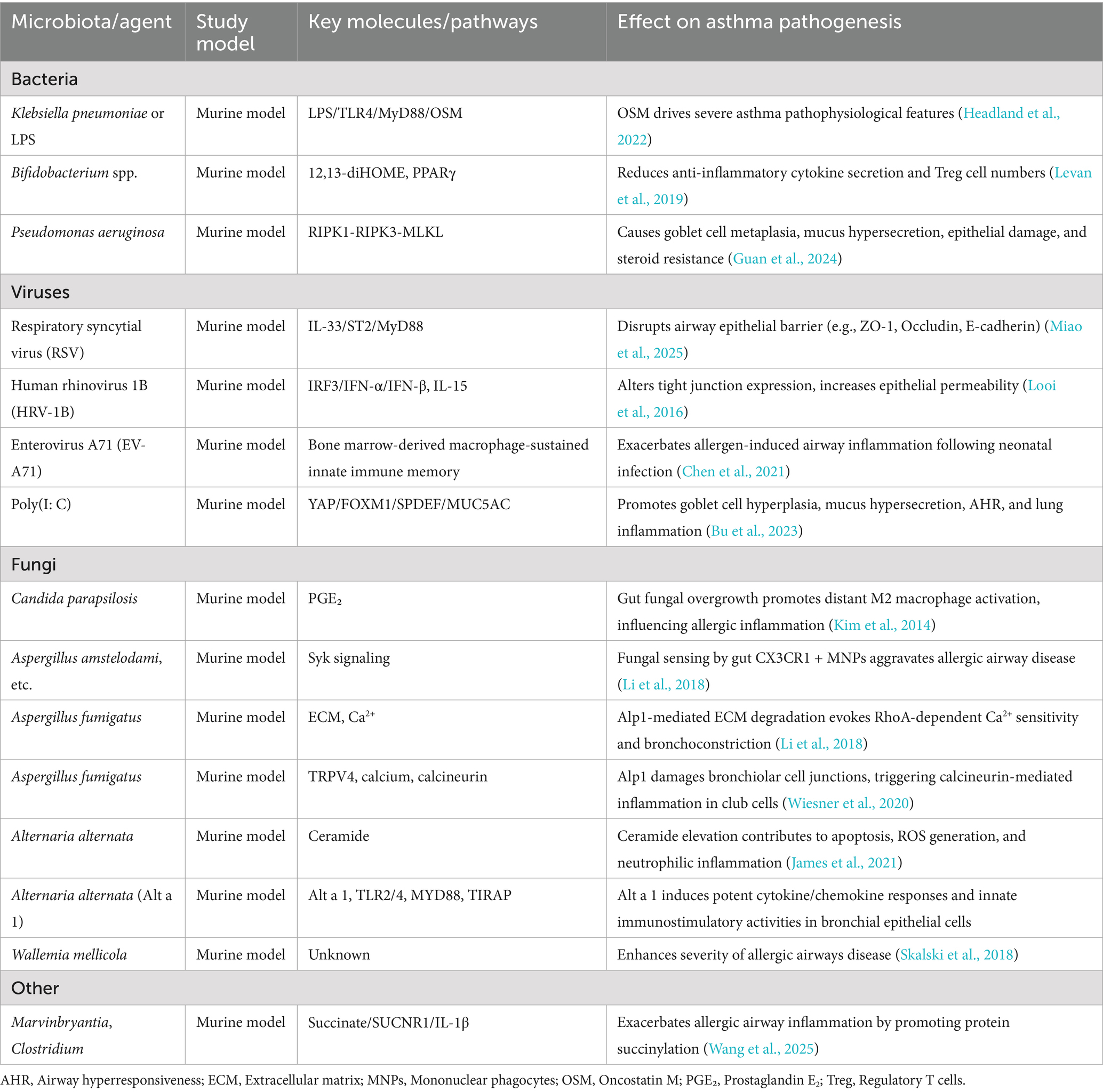 A variety of microbial pathogens exploit these vulnerabilities to disrupt epithelial homeostasis. For example, the fungal allergen alkaline protease 1 from Aspergillus directly damages bronchiolar cell–cell junctions in murine models by inducing calcium influx via the calcineurin pathway, thereby promoting Th cell–mediated pulmonary eosinophilia (Wiesner et al., 2020). Similarly, respiratory viral infections exert potent barrier-modulating effects. Respiratory syncytial virus (RSV) downregulates tight junction proteins zonula occludens-1 (ZO-1) and E-cadherin through the IL-33/ST2/MyD88 pathway (Miao et al., 2025), while human rhinovirus (HRV) remodels epithelial junctions through IL-15–dependent antiviral responses, leading to enhanced permeability and exacerbated Th2 inflammation (Looi et al., 2016). These microbial insults act synergistically with impaired epithelial repair mechanisms and heightened immune activation to produce sustained barrier dysfunction in both the gut and lungs. Importantly, accumulating evidence indicates that gut dysbiosis serves as a critical upstream driver of these processes, linking microbial community alterations to airway inflammation through barrier disruption and alarmin release. Collectively, epithelial barrier dysfunction represents a key intermediate mechanism connecting gut microbial disturbances to asthma pathogenesis.