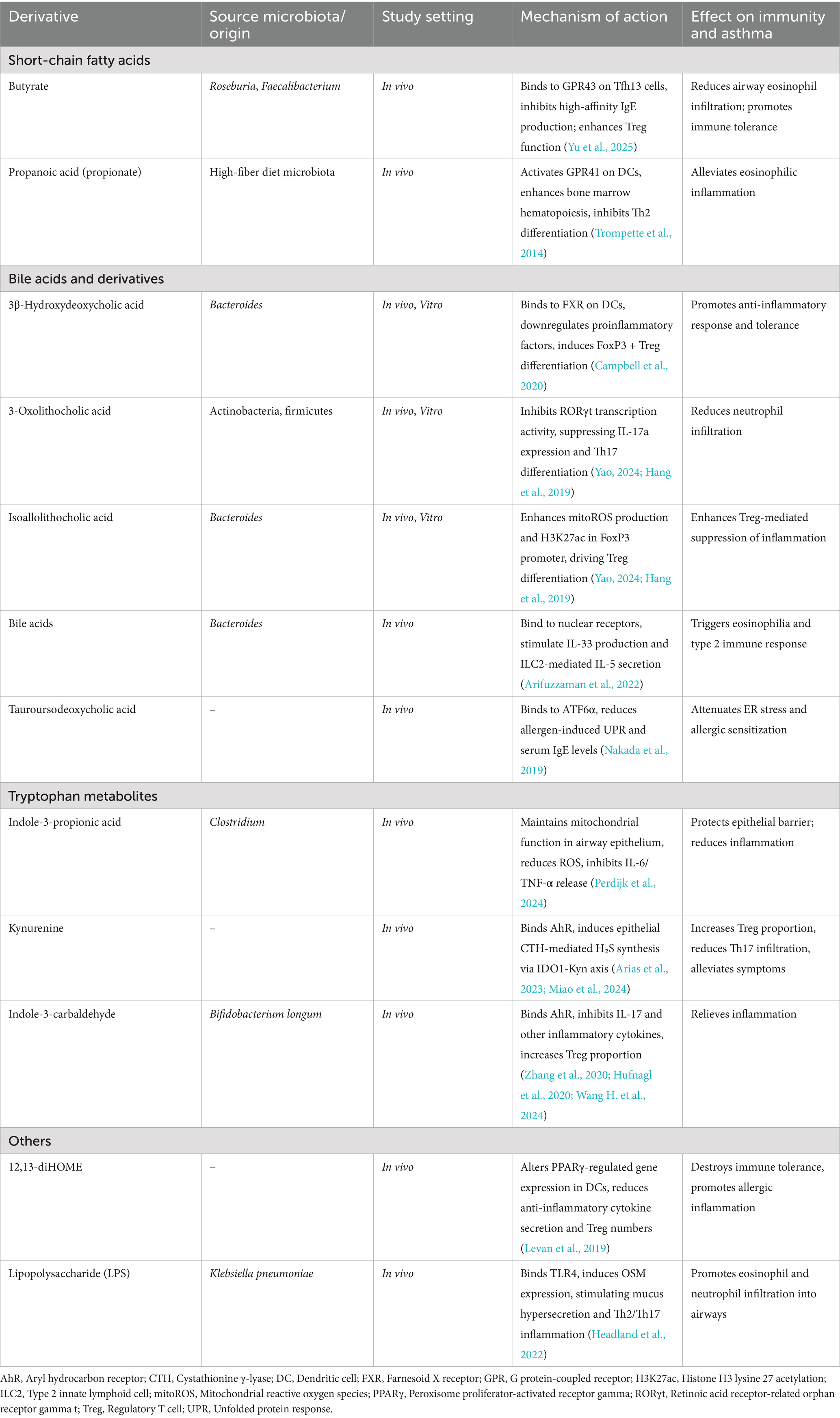 Beyond SCFAs, other microbial metabolite classes—including polyamines, tryptophan derivatives, and bile acids—play emerging roles in modulating immune homeostasis. Polyamines regulate epithelial integrity and inflammatory gene expression, while tryptophan metabolites act via the aryl hydrocarbon receptor to shape innate lymphoid and T cell responses. Secondary bile acids, such as TUDCA and β-muricholic acid, have been shown to suppress Th2 cytokine production and IgE levels, thereby attenuating allergic airway inflammation (Nakada et al., 2019). Although these pathways are less extensively characterized than SCFAs, they provide complementary mechanisms through which the microbiota can influence asthma pathogenesis.