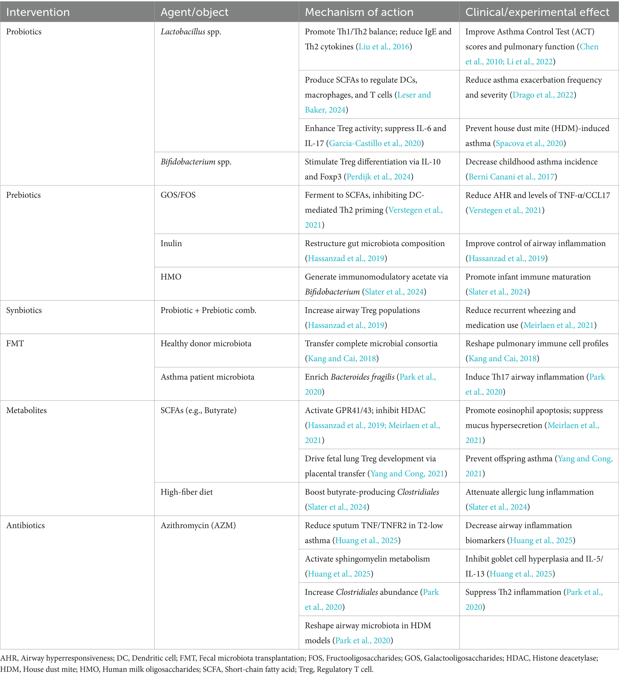 Accumulating evidence indicates that intestinal dysbiosis is a modifiable risk factor contributing to asthma pathogenesis (Liu Y. et al., 2025). Accordingly, microbiota-targeted interventions have emerged as promising approaches to restore immune homeostasis and improve clinical outcomes. These strategies include probiotics, prebiotics, synbiotics, fecal microbiota transplantation (FMT), precision antibiotic regimens, and targeted modulation of microbial metabolites. Their proposed mechanisms and available evidence are summarized in Table 3. Mechanistically, these interventions modulate disease processes by restoring microbial balance, increasing SCFA production, and downregulating type 2 inflammatory pathways, including the suppression of IL-5 and IL-13 as well as eosinophilic activity. Figure 3 illustrates the major pathways through which microbiota-based interventions may alleviate airway inflammation and clinical symptoms.