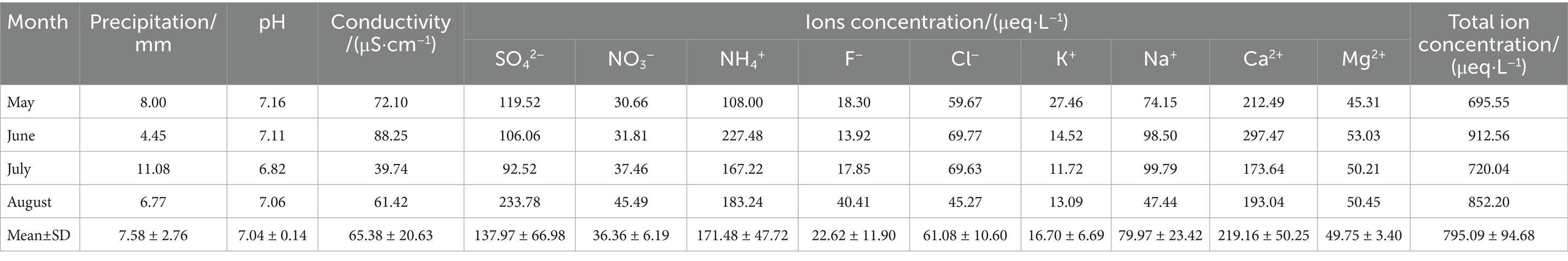 Chemical analysis of atmospheric precipitation in Baotou from May to August showed that the precipitation-weighted pH ranged from 6.82 to 7.16 (mean±SD, 7.04 ± 0.14), indicating neutral characteristics with no acidification trend (Table 1). The precipitation-weighted conductivity varied between 39.74 and 88.25 μS·cm−1 (mean±SD, 65.38 ± 20.63μS·cm−1), significantly higher than that at Waliguan, a background site for atmospheric precipitation in China (15.08 μS·cm−1) (Zhang et al., 2014). This reflects poor precipitation cleanliness in the study area, with high levels of pollutants such as water-soluble ions in precipitation. The precipitation-weighted total ion concentration ranged from 695.55 to 912.56 μeq·L−1 (mean±SD, 795.09 ± 94.68μeq·L−1), which is higher than that in most cities in China (Xu et al., 2020), consistent with the high conductivity measurements. Ionic composition followed the order: Ca2+ > NH₄+ > SO₄2− > Na+ > Cl− > Mg2+ > NO₃− > F− > K+. Among these, Ca2+, NH₄+, and SO₄2− accounted for 66.49% of the total ion concentration, making them the dominant ions during the monitoring period. Ca2+ was the most abundant cation, contributing 27.56% to the total ions and representing a major pollutant in precipitation. Previous studies have identified Ca2+ as an indicator of soil dust sources; in Baotou, frequent sand-dust events in May and June result in substantial Ca2+ input from airborne dust, consistent with the region’s sand-dust pollution characteristics (Gao et al., 2024). NH₄+ was the second most abundant cation, accounting for 21.57% of total ions—higher than the typical <10% reported in previous studies. This elevation may be linked to agricultural activities in the surrounding areas, such as spring fertilization (Hůnová et al., 2022). SO₄2− was the dominant anion, comprising 17.35% of total ions and acting as the primary acidic ion in precipitation. Its high concentration is primarily attributed to sulfate formation via atmospheric oxidation of sulfur dioxide (SO₂) from coal combustion, aligning with Baotou’s coal-dominated energy consumption structure.