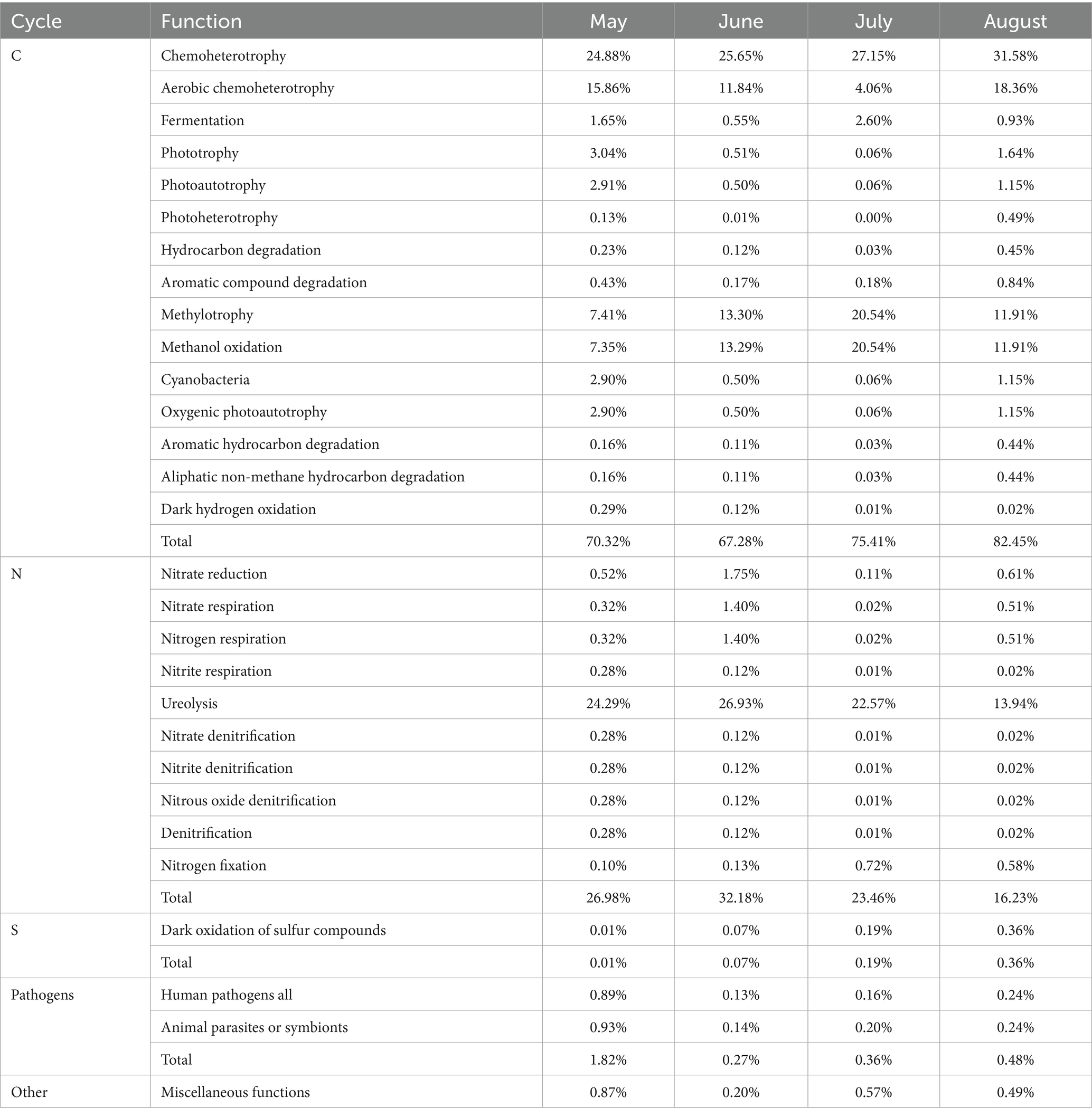 Functional analysis using FAPROTAX identified 28 known ecological bacterial functions for bacteria with relative abundance >0.1%. These include processes related to the carbon cycle (average relative abundance: 73.86%), nitrogen cycle (24.71%), sulfur cycle (0.16%), and pathogens (0.73%) (Table 2). The carbon cycle accounted for the highest proportion, involving 15 functions, with chemoheterotrophy (average relative abundance: 27.32%), aerobic chemoheterotrophy (12.53%), methylotrophy (13.29%), and methanol oxidation (13.27%) being the most dominant. The nitrogen cycle involved 10 functions, with ureolysis (21.93%) being the most prominent. These five functions constitute the main ecological functions of bacteria in atmospheric precipitation. Notably, the relative abundance of ureolysis in atmospheric precipitation in Baotou City was relatively high, peaking in June, which was consistent with the trend of high NH₄+ concentrations in precipitation (also peaking in June). This is presumably related to severe NH₄+ pollution in Baotou’s precipitation. The relative abundance of sulfur cycle-related functions was the lowest, with the highest value occurring in August, which aligned with the trend of high SO₄2− concentrations in precipitation (peaking in August), suggesting a correlation with severe SO₄2− pollution in Baotou’s precipitation.