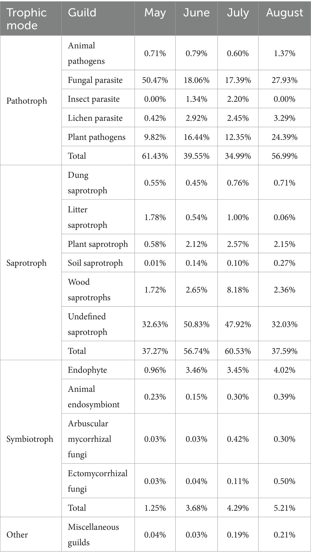 FUNGuild analysis identified 15 known ecological fungal functional guilds with relative abundance >0.1%, dominated by pathotrophs (average relative abundance: 48.24%) and saprotrophs (48.03%), with a low abundance of symbiotrophs (3.61%) (Table 3). The most prevalent subtypes included undefined saprotrophs (40.85%; saprotrophs) and, among pathotroph guilds, fungal parasites (28.46%) and plant pathogens (15.75%), collectively representing the core ecological functions of fungi in precipitation.