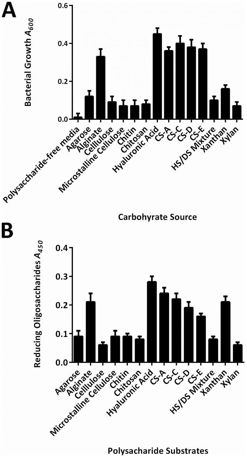 Moreover, strain WS15 could hardly grow on agarose, cellulose, and chitin, whereas it could grow efficiently on six kinds of polysaccharides as the sole-carbon source (Figure 1A), especially with the A600 values of cell densities greater than 0.20 to show obvious turbidity when grown on alginate, HA, and four tested CS polysaccharide types, that is, CS-A, CS-C, CS-D, and CS-E. Furthermore, by DNS-reducing sugar tests, the bacterial extracellular enzyme preparation could degrade nearly little agarose, cellulose, and chitin to produce significant oligosaccharide products, while it could degrade at least seven types of polysaccharides to yield reducing oligosaccharide products for further bacterial utilization, in particular with the A450 values of reducing sugar product greater than 0.20 when against alginate, HA, and xanthan (Figure 1B).