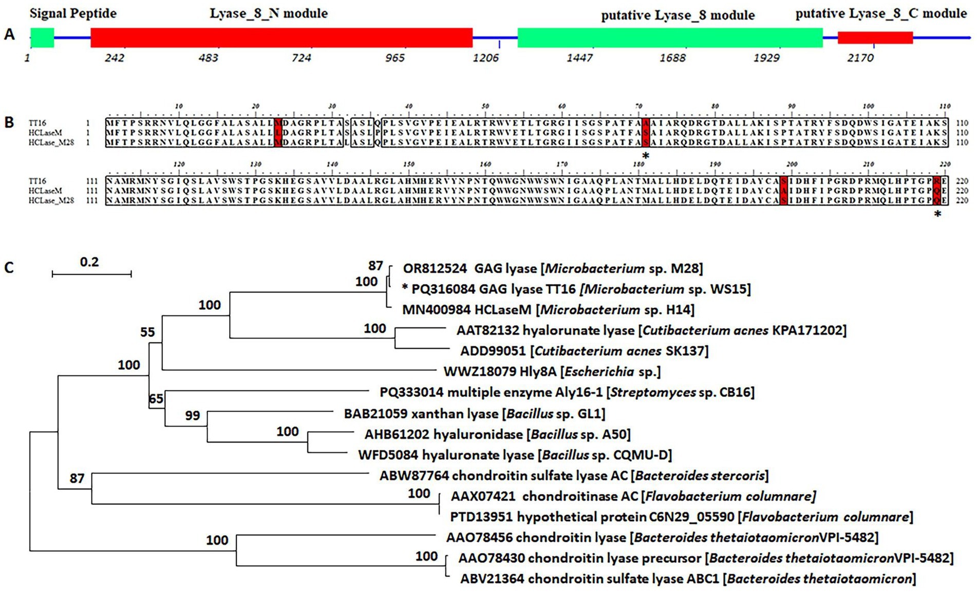 In general, elucidated lyases containing GAG modules could broadly degrade various GAG polysaccharide substrates (Elmabrouk et al., 2011; Zou et al., 2025; Wayne and Sheryl, 2000; Sun et al., 2019; Ju et al., 2024), while few were active against other polysaccharide types except for the multiple enzyme Aly16 − 1 of another actinomycete, Streptomyces sp. strain CB16, which could degrade alginate optimally instead (Zeng et al., 2024). Similar to Aly16-1, the protein TT16 contained PL8 modules in sequence (Figure 2A) and shared sequence identities ranging from 30 to 36% with most characterized PL8 family members (Figure 2C) from either marine or terrestrial environments. Moreover, the protein TT16 showed a sequence identity of approximately 98% to the HCLaseM of Microbacterium sp. strain H14 (Sun et al., 2019) and approximately 99% to the HCLase_M28 of Microbacterium sp. strain M28 (Ju et al., 2024), with only a few different amino acid residues, for example, it was the residues Ala71 and Arg 219 in the TT16 sequence, while both were the residues Ser71 and Gln219 in the HCLaseM and the HCLase_M28 (Figure 2B). Therefore, the protein TT16 would be identified as an endo-type GAG lyase according to existing reports. However, the results of detailed experiments were found to be opposite, as follows: