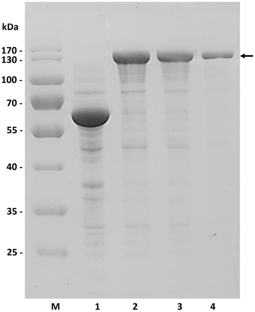 Figure 3. Expression and purification of the recombinant protein rCTF-TT16 (SDS–PAGE). M, protein molecular weight standards with the sizes of 170, 130, 100, 70, 55, 40, 35, and 25 kDa. Lane 1, lysate of the controlling E. coli BL21(DE3) cells containing the plasmid pCold TF™. Lane 2, cell lysate of the positive bacteria containing the plasmid pCTF-TT16. Lane 3, supernatant of Lane 2. Lane 4, purified protein of rCTF-TT16.