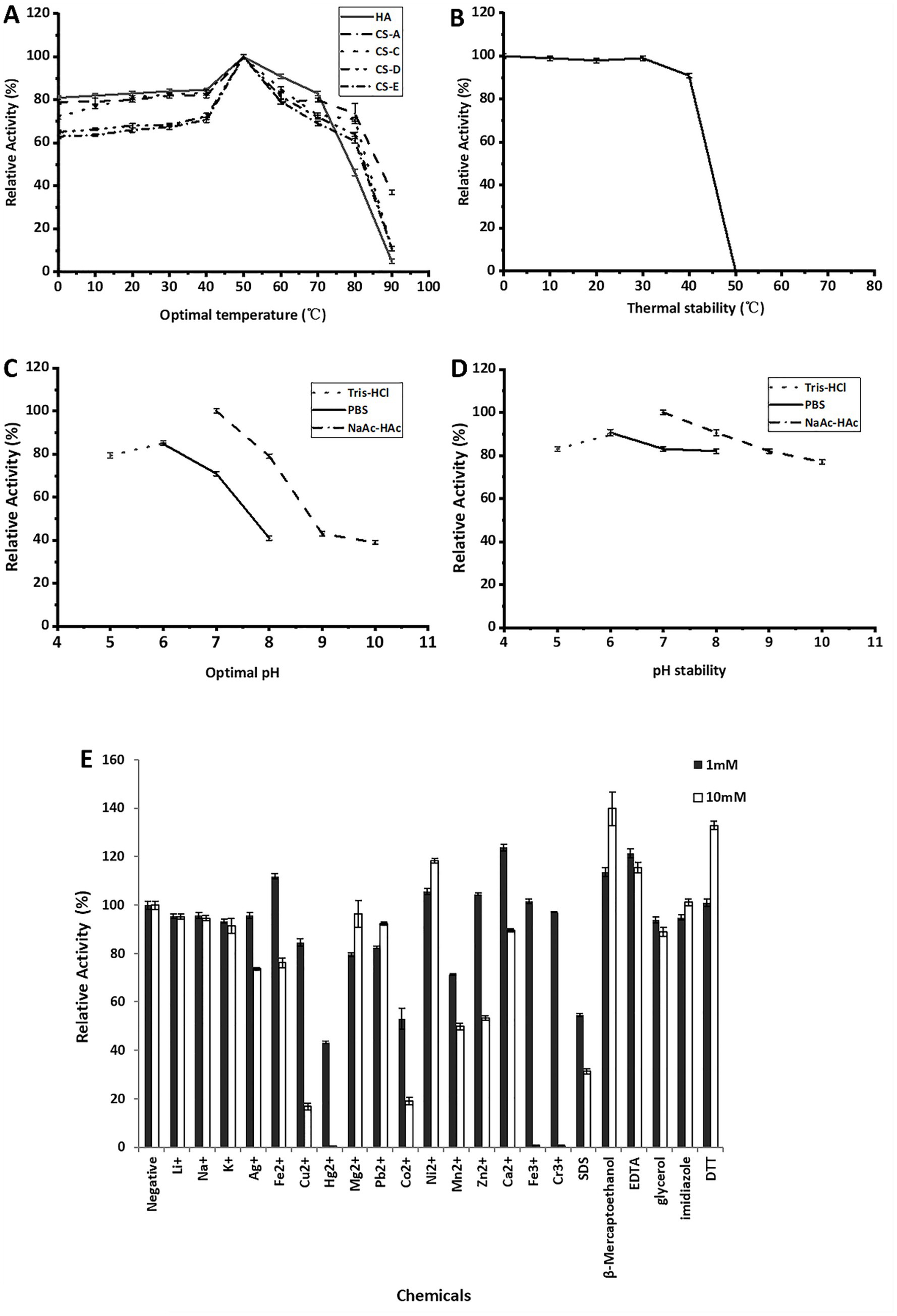 Figure 4. Biochemical characteristics of the enzyme rCTF-TT16. (A) The optimal temperature against various polysaccharide substrates. (B) Thermal stability of rCTF-TT16 on various polysaccharides. (C) The optimal pH value against the HA polysaccharide. (D) pH stability against HA. (E) Effects of different metal ions and chemicals on the activity of rCTF-TT16 in the presence of 1 and 10 mmol/L, respectively. Average values ± standard bars were indicated.