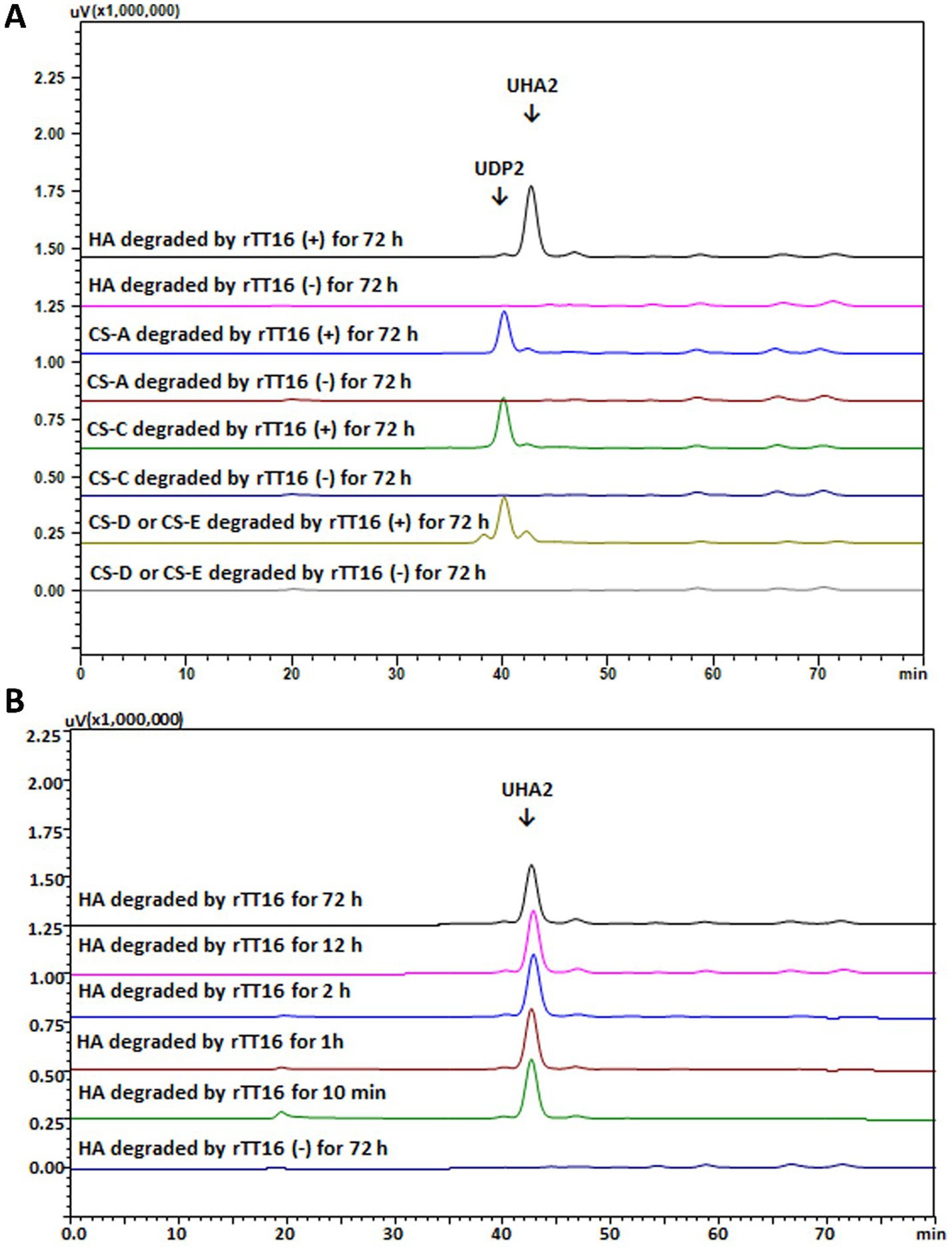 Figure 5. Gel filtration HPLC analysis of the GAG degradation by TT16 using the GAG substrates and the Superdex™ peptide 10/300 column. (A) The degradation modes of rTT16 against HA and various CS polysaccharides, yielding unsaturated CS disaccharide (UDP2) or unsaturated HA disaccharide (UHA2); (B) Time-course HPLC analysis of oligosaccharide products during the digestion of HA by rTT16; Negative group (−): reactions without any enzymes.
