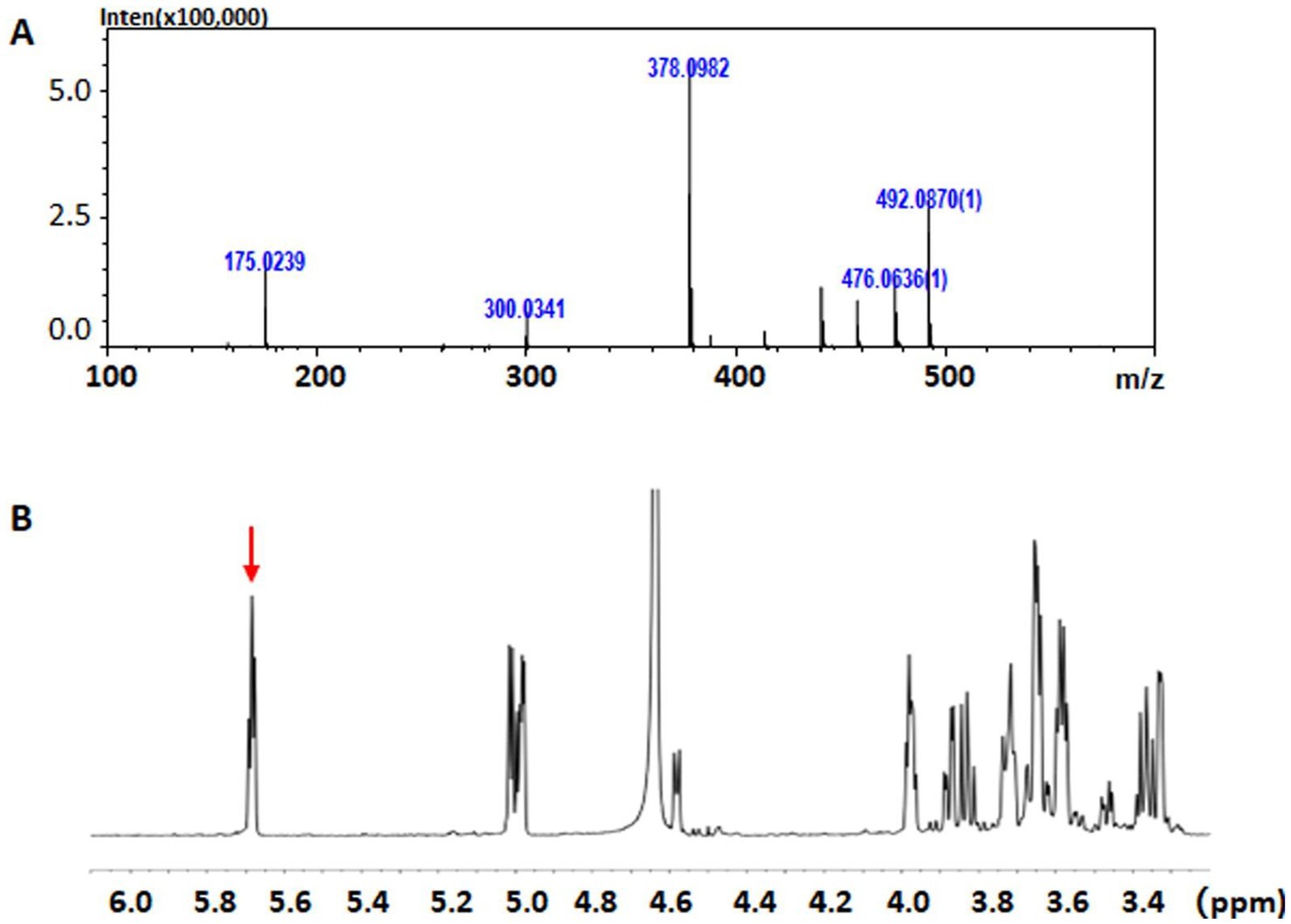 Figure 6. The mass spectrum (A) and the 1H-NMR spectrum (B) of HA-derived unsaturated disaccharide products. (A) The m/z peak of 378 indicates a pseudo-anion [379-H]−, suggesting an unsaturated HA disaccharide. (B) The signals of H-absorbance at ~5.7 ppm were indicated by a red arrow, meaning the β-elimination of a GAG lyase.