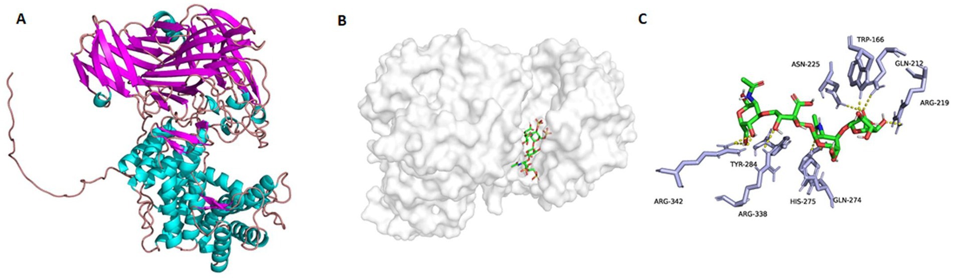 Figure 7. The homology-based protein structure of TT16 (A), he complex with an HA tetrasaccharide substrate (B), and possible bindings to the sulfate-free disaccharide unit (C). The protein TT16 (A) combined a tetrasaccharide donor (C) with its cavity (B) due to the binding and catalysis actions of the key amino acid residues.