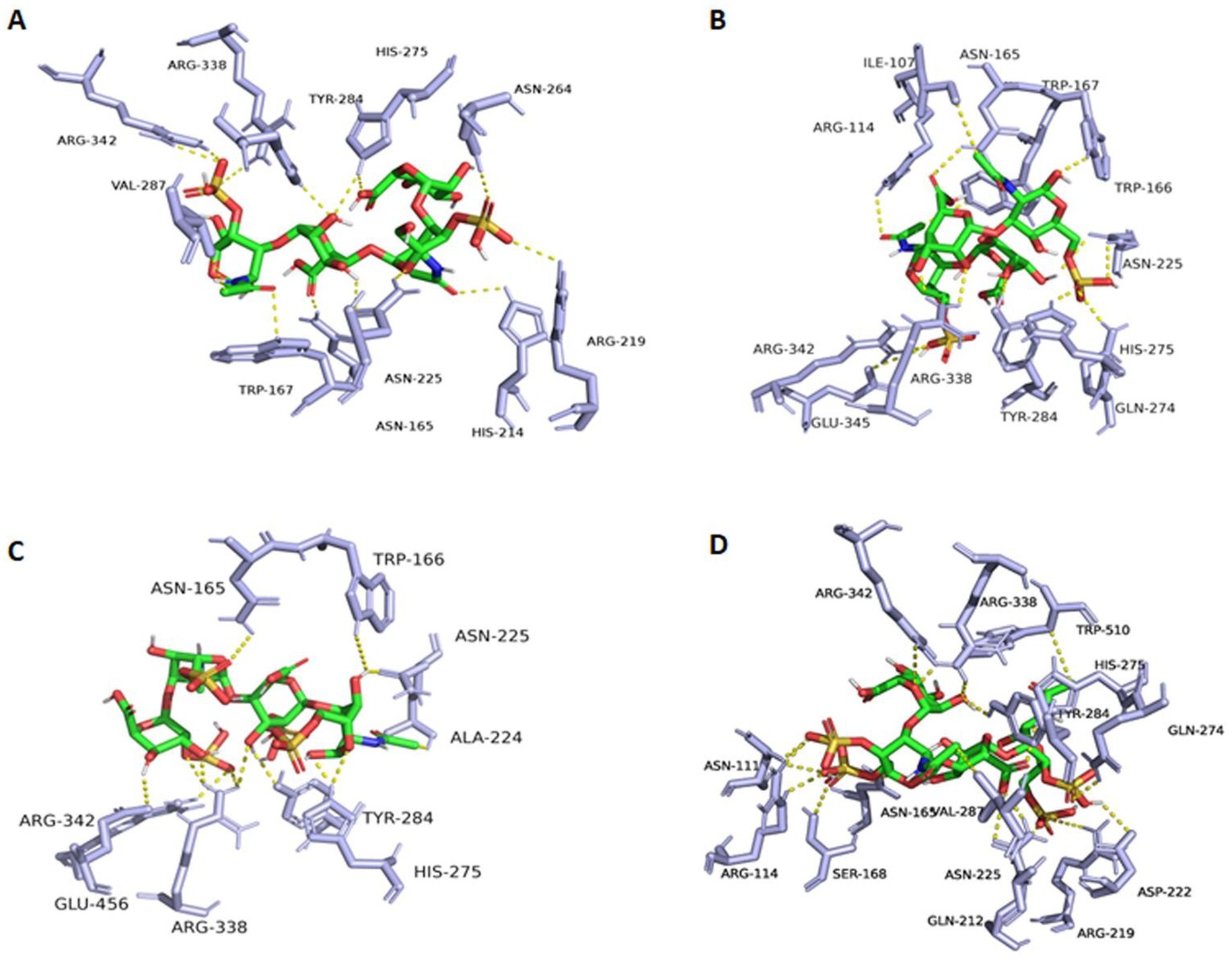 Figure 8. Complexes of TT16 and GAG tetrasaccharide substrates. (A) CS-A; (B) CS-B; (C) CS-D; (D) CS-E. By the molecular docking of these various donors to the protein TT16 (acceptor), binding energies of every most stable enzyme-tetrasaccharide complexes were then calculated.