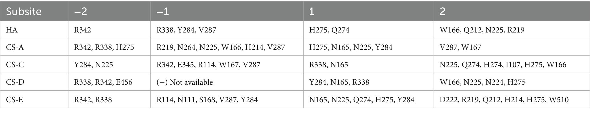(acceptor) was then molecule-docked with the substrate (donor) of HA, CS-A, CS-C. CS-D, and CSE tetrasaccharide using the software AutoDock Vina 1.2.5 (Bugnon et al., 2024) and through the PLIP online analysis6 (Schake et al., 2025). The binding energy of each of the most stable enzyme-oligosaccharide complexes was calculated and visualized using the PyMOL 2.1.1 software (Rauf et al., 2015) and LigPlot+ software (Laskowski and Mark, 2011). Key active site residues and their roles were estimated according to reported references (Elmabrouk et al., 2011; Zou et al., 2025).