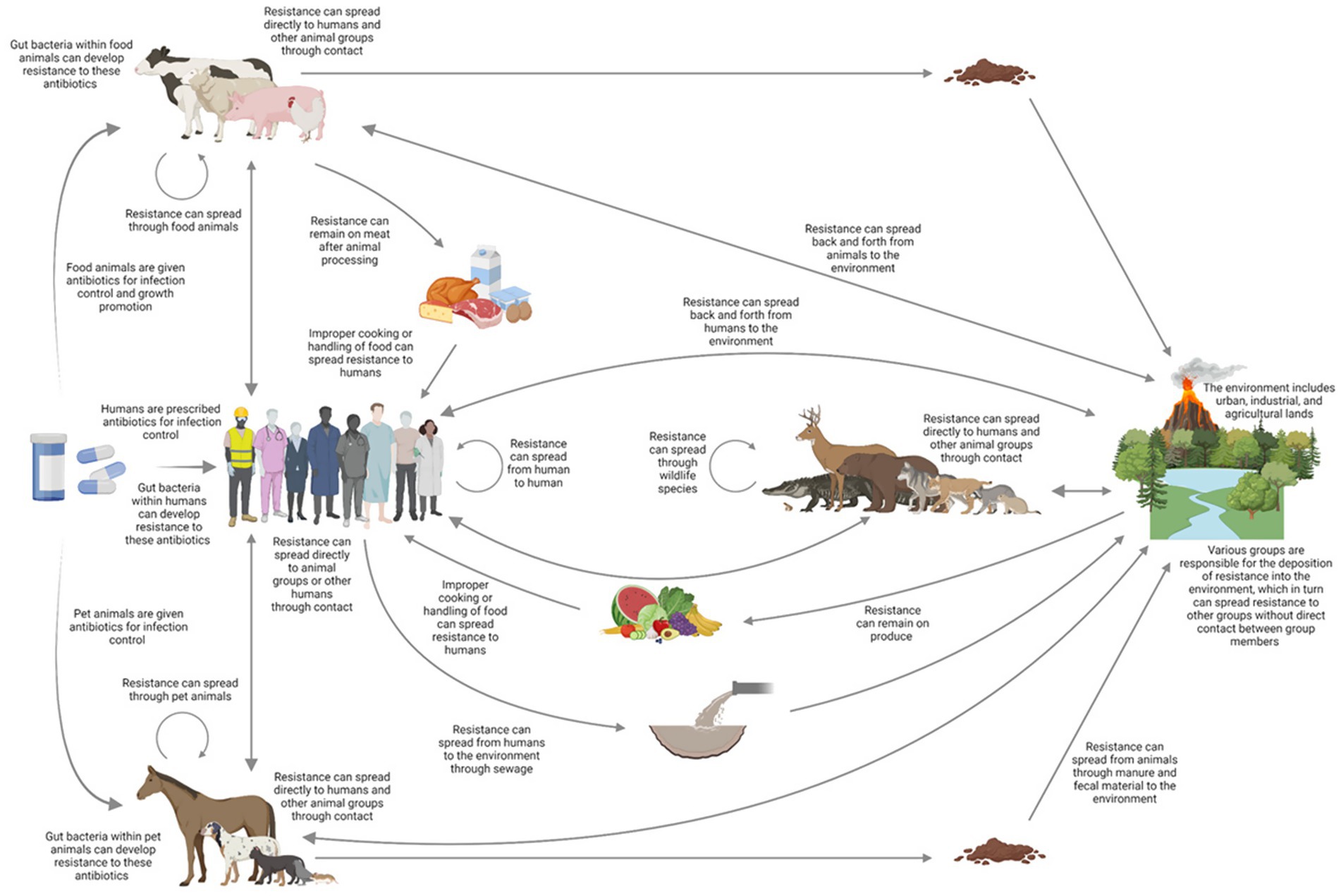 Figure 1. Routes of AMR may be transmitted through various direct and indirect routes to humans, livestock, companion animals, the environment, and wildlife shown by arrows. The overall effectiveness of these channels will vary significantly depending on the type of microbe and resistance mechanism, as well as the environment and location. Adapted from a diagram of the intricate process presented by Woolhouse and Ward (2013).