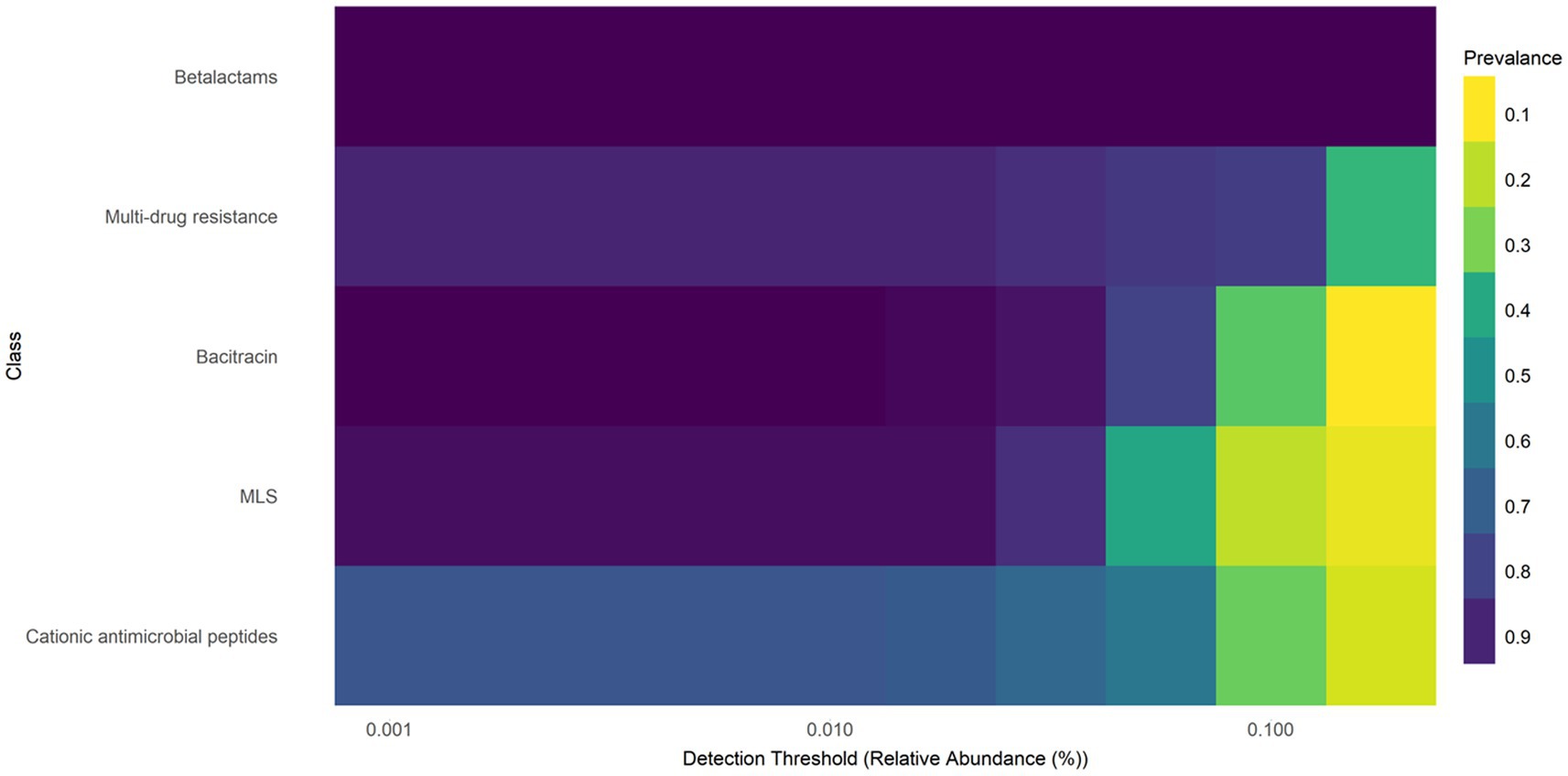 The core resistome refers to the set of ARGs, gene groups, mechanisms, or classes that are consistently detected in a large proportion of a population, exceeding a defined abundance threshold. In E. coli isolates from farmed WTD in Florida, the core resistome comprises ARGs associated with five major antimicrobial classes: β-lactams, multidrug resistance (MDR), bacitracin, macrolide-lincosamide-streptogramin (MLS), and cationic antimicrobial peptides (CAP). These ARGs are both abundant and broadly distributed across the sampled population (Figure 2). The heat map of the core resistome illustrates five classes to be prevalent in at least 10% of the samples. For example, the prevalence of the bacitracin class having a relative abundance (or detection threshold) of 0.001%, is 90%. As the detection threshold becomes more stringent, with a relative abundance of at least 0.100%, the prevalence drops to approximately 0.20 (only 20% of samples will contain bacitracin resistance at a relative abundance of 0.100%).