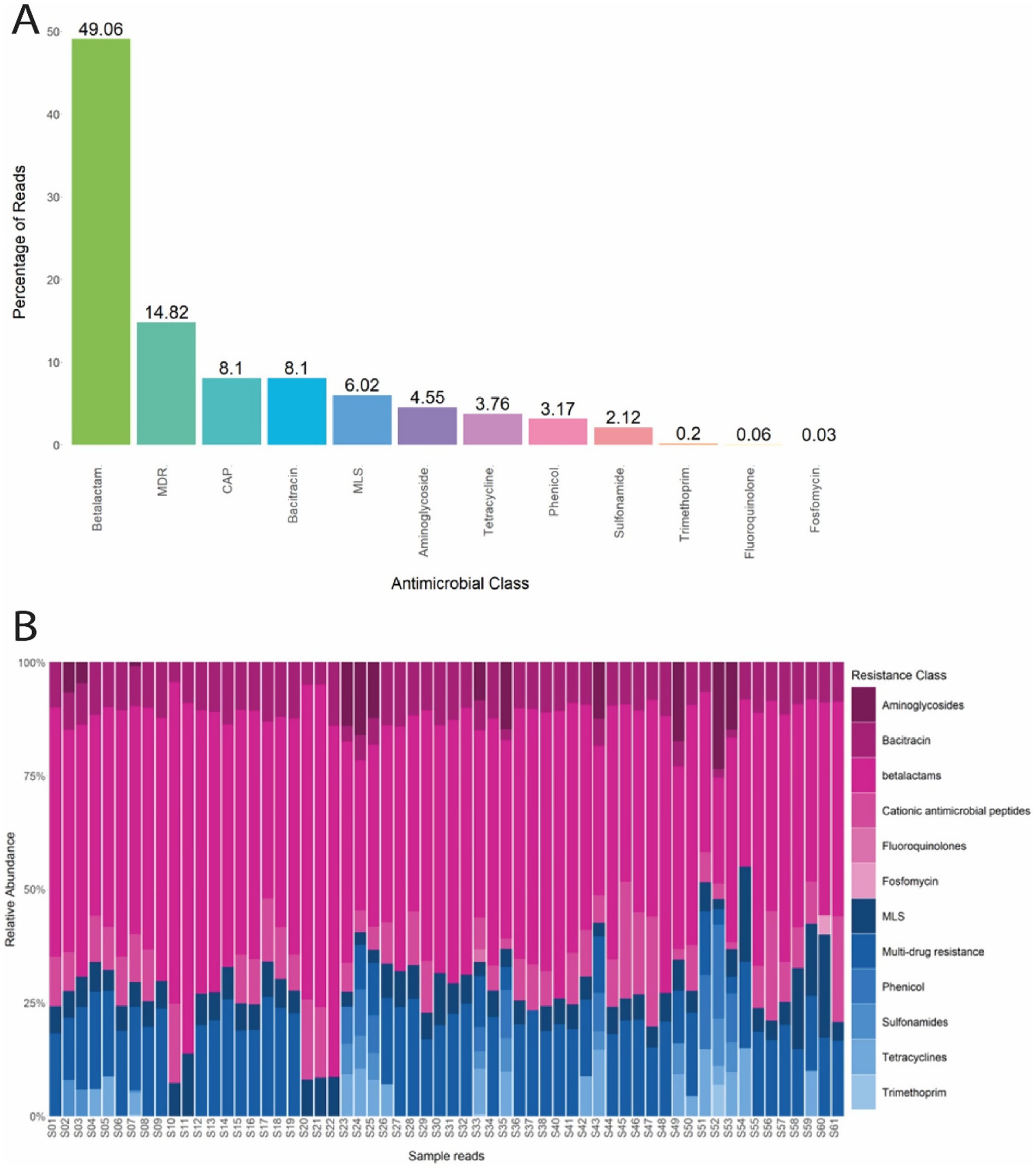 Figure 3. (A) Percentage of reads from E. coli isolates that confer resistance to each antimicrobial class. (B) Normalized relative abundance (percentage) of ARGs in E. coli isolates grouped by resistance class for all 60 samples. Multi drug resistance (MDR); Cationic antimicrobial peptides (CAP); Macrolide, lacosamide, Streptogramin (MLS).
