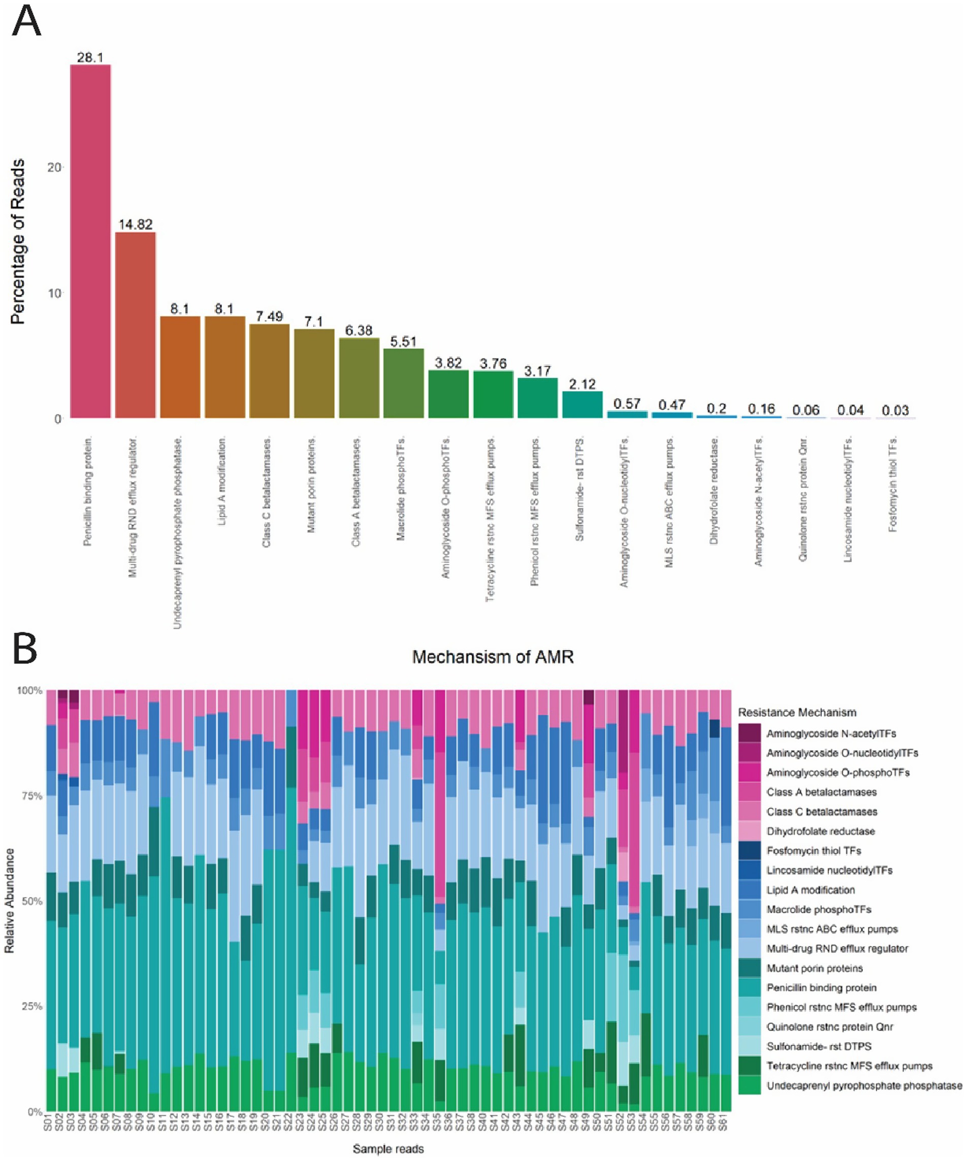 Figure 4. (A) Percentage of reads from E. coli isolates for each mechanism of antimicrobial resistance. (B) Normalized relative abundance (percentage) of ARGs in E. coli isolates grouped by resistance mechanism for all 60 samples. N-acetylTFs (N-acetyltransferases); O-nucleotidylTFs (O-nucleotidyltransferases); O-phosphoTFs (O-Phosphotransferases); Transferases (TFs); rstnc (Resistance); ABC (ATP- binding cassette); RND (Resistance-Nodulation-Division); MFS (major facilitator superfamily); rst (resistant); DTPS (dihydropteroate synthase).