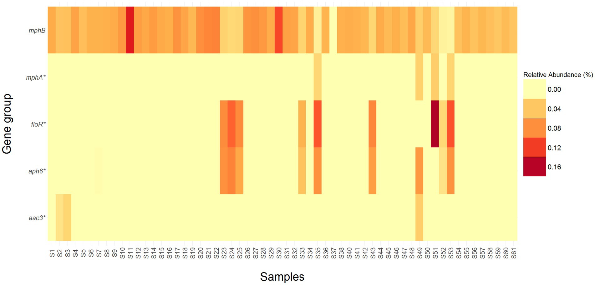 Figure 5. Heatmap representing the relative abundance (percentage) of high-risk ARG groups (Rank 1) detected in each sample. ARG groups mphA, floR, aph6, and aac3 contain genes that are classified in different risk levels and are denoted by an *.