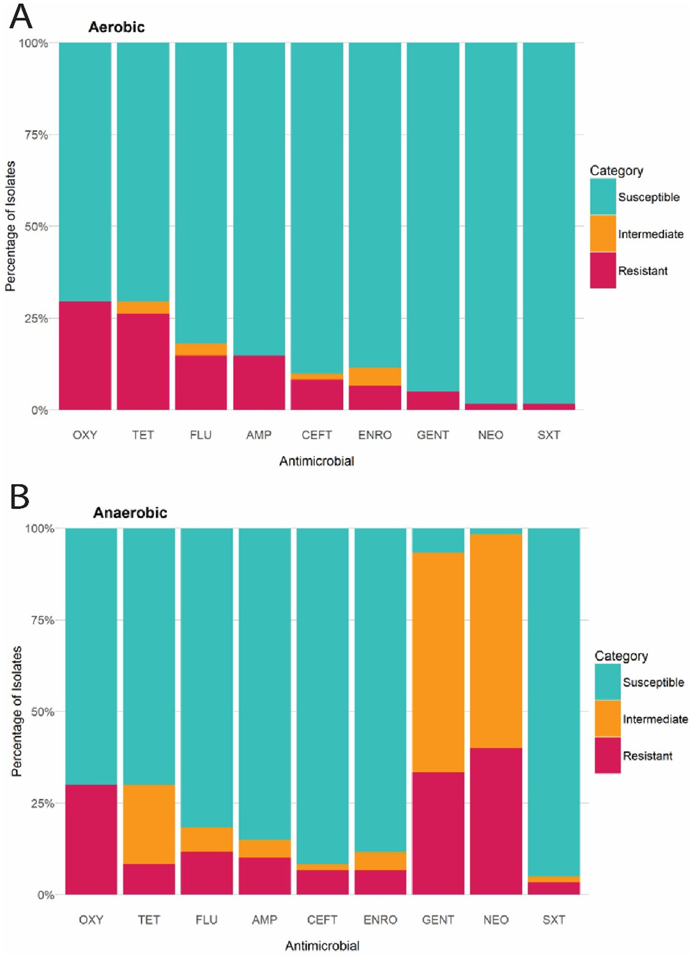 Figure 6. (A) Bar chart illustrating the percentage of E. coli isolates from WTD classified as Susceptible, Intermediate, or Resistant to each antimicrobial compound, according to CLSI breakpoints under aerobic conditions. (B) Bar chart illustrating percentage of E. coli isolates from WTD classified as Susceptible, Intermediate, or Resistant to each antimicrobial compound, according to CLSI breakpoints under aerobic conditions. AMP (Ampicillin); CEFT (Ceftiofur); FLU (Florfenicol); NEO (Neomycin); GENT (Gentamicin); ENRO (Enrofloxacin); TET (Tetracycline); OXY (Oxytetracycline); SXT (Trimethoprim–sulfamethoxazole).