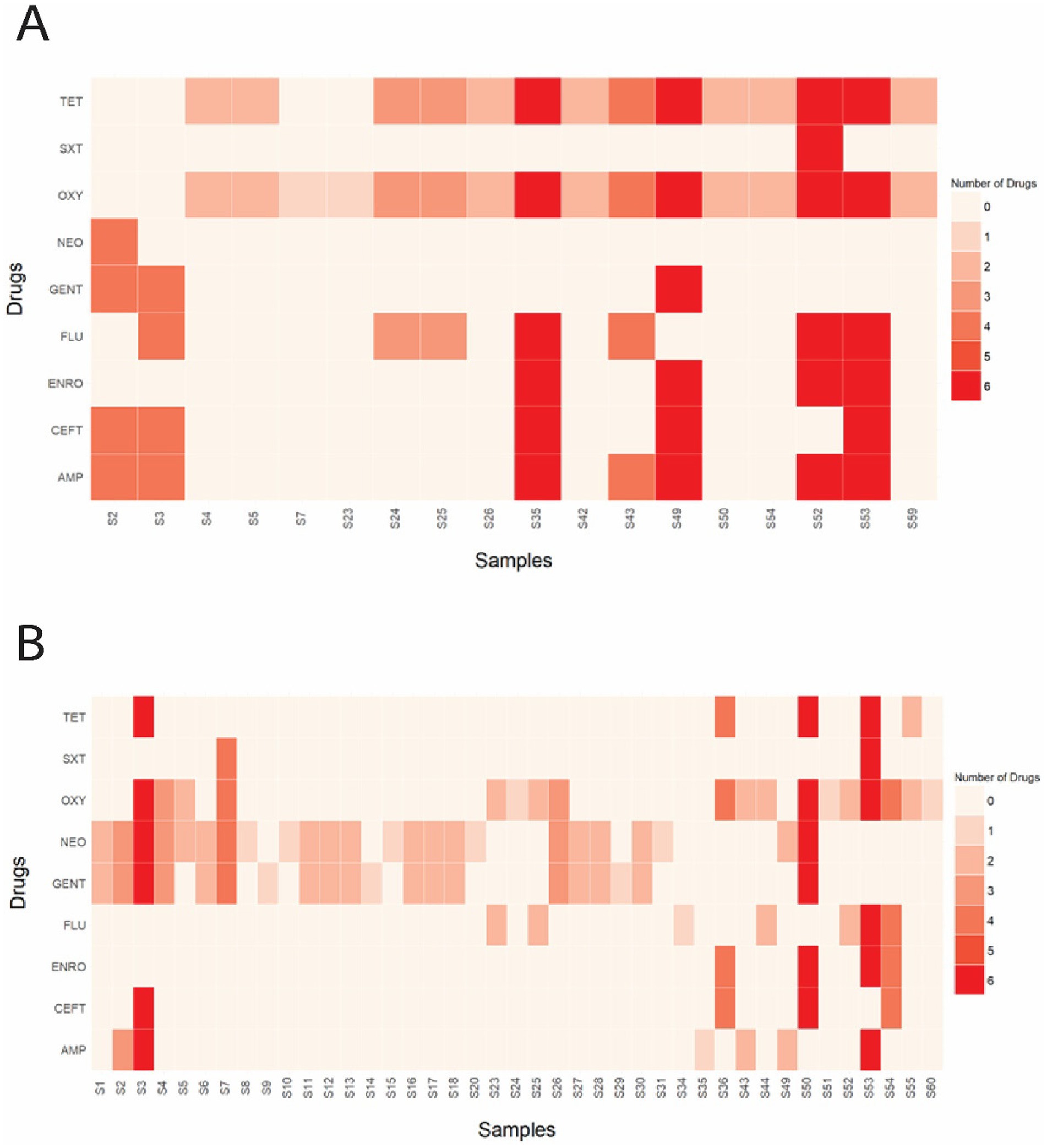 Figure 8. (A) Heatmap illustrating the total number and specific drug(s) to which each sample displayed phenotypic resistance under aerobic conditions. (B) Heatmap illustrating the total number and specific drug(s) to which each sample displayed phenotypic resistance under anaerobic conditions. AMP (Ampicillin); CEFT (Ceftiofur); FLU (Florfenicol); NEO (Neomycin); GENT (Gentamicin); ENRO (Enrofloxacin); TET (Tetracycline); OXY (Oxytetracycline); SXT (Trimethoprim–sulfamethoxazole).
