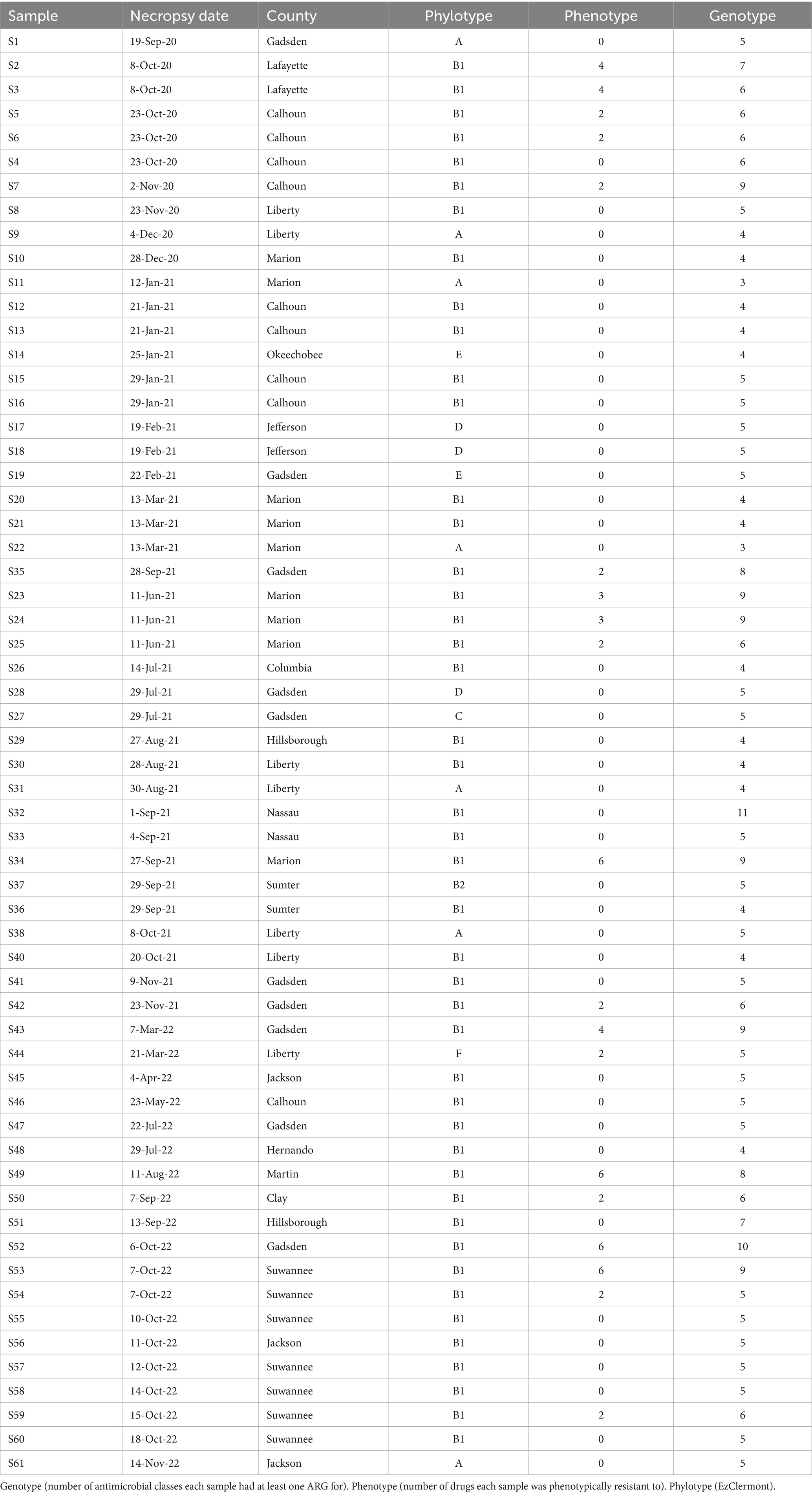 Table 1. Typing information for animals and E. coli isolates collected from farmed WTD in Florida between September 2020 and November 2022 (n = 60).