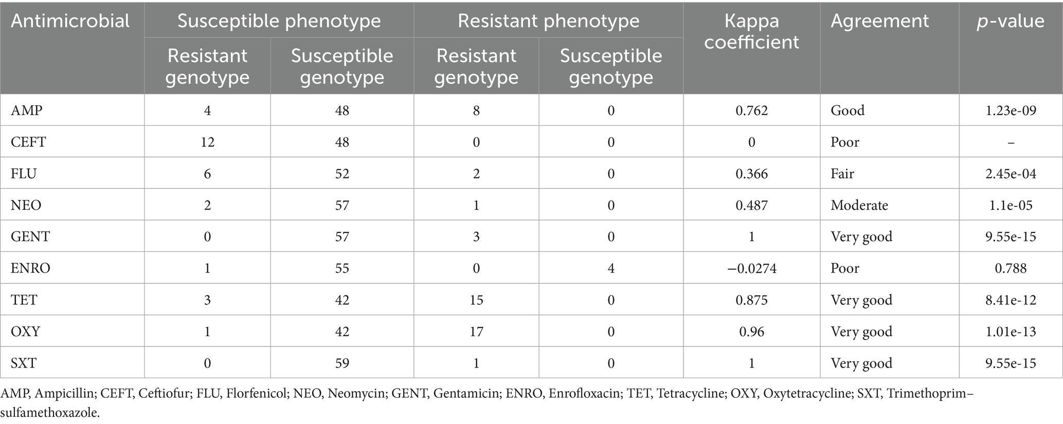 The resistant genotype of the E. coli isolates was identified through whole genome sequencing, and the use of the AMR++ pipeline to align the sequencing reads to a curated ARG database. A comprehensive workflow for genotype and phenotype determination of the E. coli isolates is outlined in the above sections. Cohen’s kappa statistics were used to assess the agreement between genotype and phenotype. The presence of the cmy, ctx, or tem gene groups was classified as a resistant genotype for AMP and CEFT, while the tetA, tetB, or tetD gene groups were considered a resistant genotype for TET and OXY. For GENT and NEOM, a resistant genotype was determined by the existence of the aac3 gene group, and for FLU, the floR or cmlA, gene groups. A resistant genotype to ENRO was linked to the qnrS gene group. Due to the complex interaction of SXT, which inhibits two pathways in folate synthesis, the simultaneous presence of the sulII, sulIII, and dfrA gene groups was considered a resistant genotype (Projan, 2002). The ZOI breakpoints for Enterobacterales, as outlined by CLSI and NCCLS, were used to classify phenotypic resistance. For statistical purposes, isolates in the intermediate category were treated as susceptible (Schwan et al., 2021). Kappa coefficient (κ) values were interpreted as follows: <0.2 = poor, 0.21–0.4 = fair, 0.41–0.6 = moderate, 0.61–0.8 = good, and 0.81–1.0 = very good agreement (Azen and Walker, 2021). A two-sided z-test with a p-value < 0.05 was considered statistically significant.