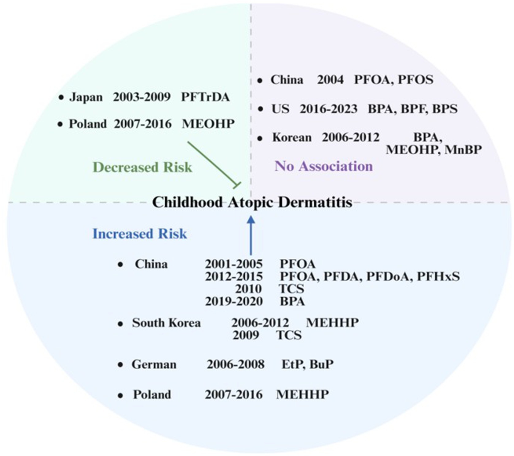 Collectively, studies indicated that the association between prenatal PFAS exposure and AD exhibited complexity. Certain research suggested specific PFAS compounds (notably PFOA) could increase the risk of childhood AD, with evidence pointing toward gender- or gene-specific susceptibility. However, other studies have failed to establish significant associations. These discrepancies could stem from spatial and temporal heterogeneity in PFAS exposure levels, variations in mixture composition, and modulatory effects of host factors such as sex specificity and genetic background, necessitating further investigation into the integrated effects of chemical mixtures and their biological mechanisms to establish causal relationships.
