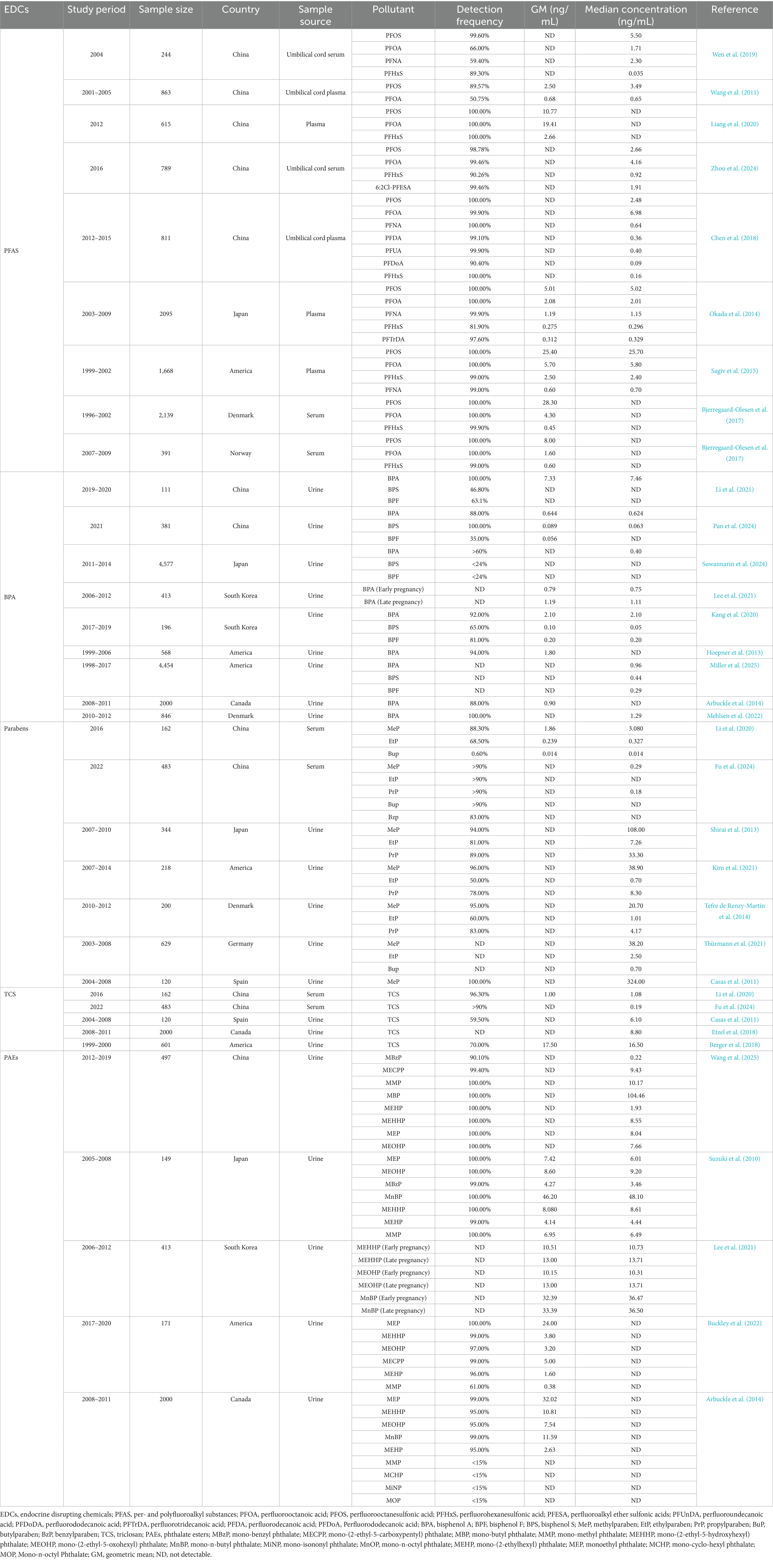 Pregnancy and early life represent key developmental windows for fetal immune system maturation. Maternal exposure to EDCs could transfer to the fetus and neonate via the placenta or breast milk, and disrupt fetal immune programming by altering the maternal-fetal microenvironment, thereby increasing the child’s risk of developing AD (Bansal et al., 2018). In recent years, a growing body of epidemiological evidence indicated that prenatal EDCs exposure could be significantly associated with the development and progression of AD in children (Spanier et al., 2012). The review was to summarize and critically appraise current evidence on the association between prenatal exposure to the emerging EDCs and AD in children. Furthermore, it could provide a scientific basis for developing effective strategies to mitigate prenatal EDCs exposure and implementing early-life interventions for childhood AD.