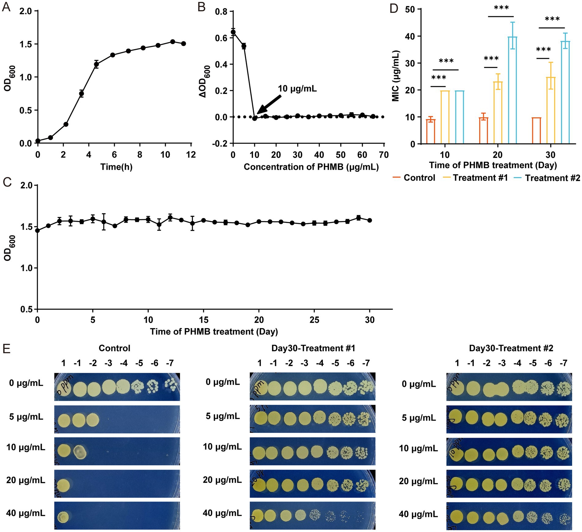Figure 1. S. aureus developed resistance after continuous exposure to 2 μg/mL PHMB. (A) Growth curve of MRSA ATCC 43300 based on OD600. (B) MIC of PHMB determined by OD600 changes after 24 h. (C) OD600 changes during 30 days of continuous PHMB exposure. (D) Comparison of MIC values between control and treatment groups on days 10, 20, and 30. (E) Resistance assessment of MRSA-PR via spot plating after 1:107 dilution. One control and two treatment groups were analyzed with two technical replicates per condition. Data shown as mean ± SD from ≥3 independent experiments. ***: p < 0.001.