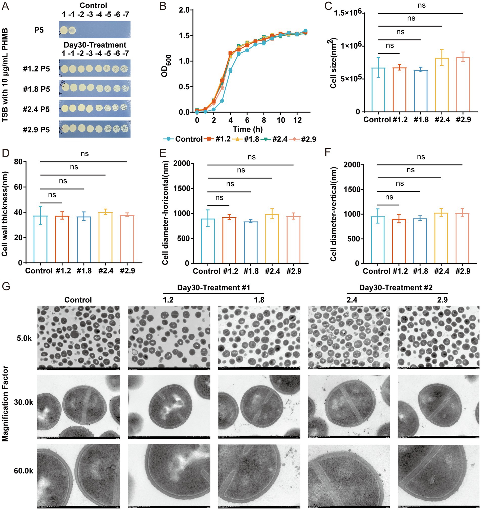 Figure 2. MRSA-PR strains exhibit inheritable feature and show similar growth and cell morphology to the wild-type strain. (A) Spot test of MRSA-PR after five passages, using 10-fold serial dilutions plated on TSB agar with 10 μg/mL PHMB. (B) Growth curves of MRSA-PR strains (#1.2, #1.8, #2.4, #2.9) and wild-type. (C–F) Quantitative comparison of cell morphology: surface area (C), cell wall thickness (D), transverse (E) and longitudinal diameter (F). (G) TEM images of wild-type and MRSA-PR strains at 5.0 k, 30.0 k, and 60.0 k magnifications. Data shown as mean ± SD from ≥3 experiments. ns: not significant.
