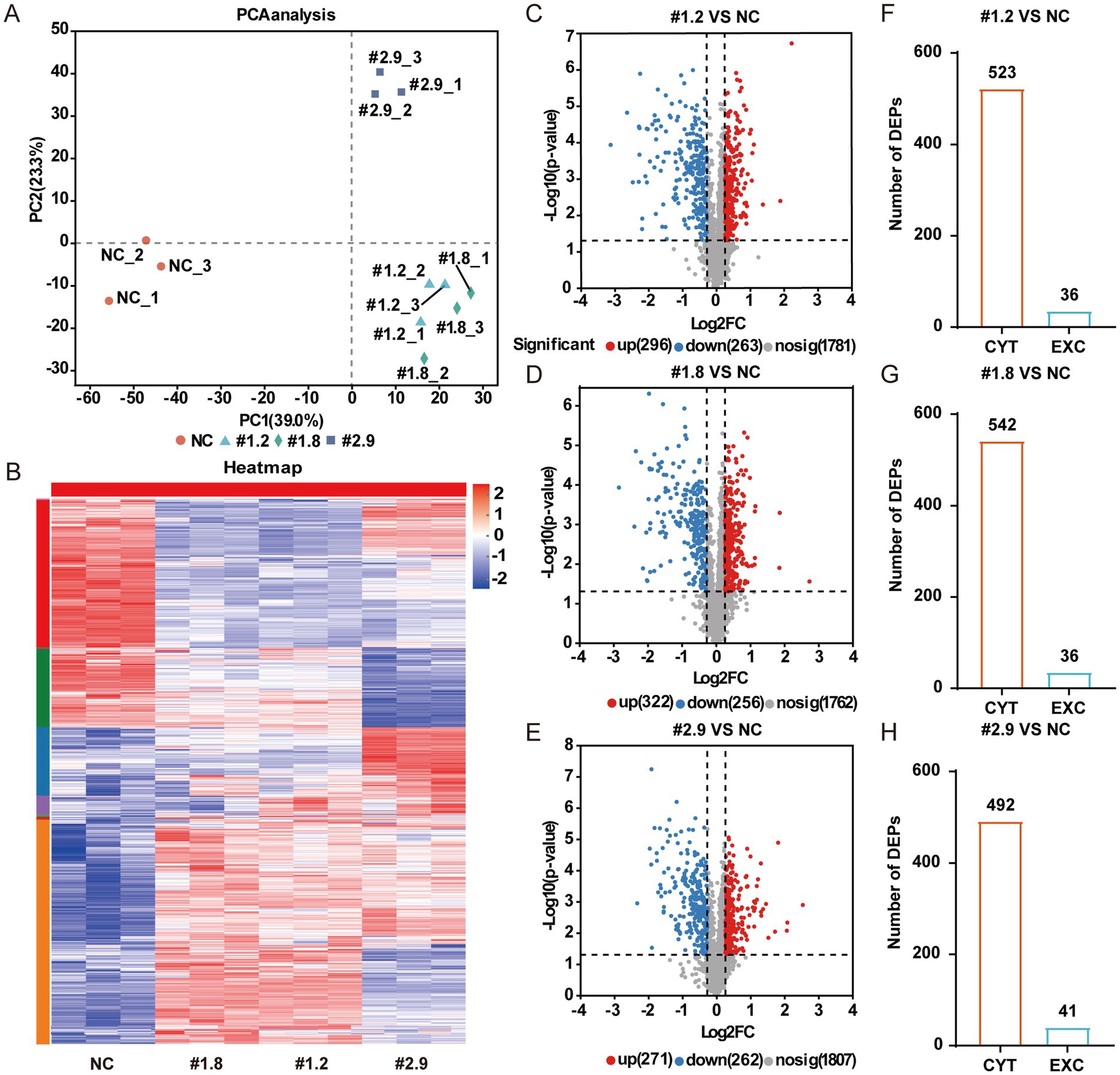 Figure 3. MRSA-PR strains show distinct protein expression profiles compared to the wild-type. (A) PCA showing protein expression similarities between MRSA-PR (#1.2, #1.8, #2.9) and wild-type. Each group includes three biological replicates. (B) Heatmap of protein abundance across strains. Color intensity reflects relative protein expression levels. (C–E) Volcano plots of DEPs: MRSA-PR vs. wild-type. Red: upregulated; blue: downregulated; gray: not significant. (F–H) Subcellular localization of DEPs in MRSA-PR vs. wild-type. CYT: cytoplasmic; EXC: extracellular.