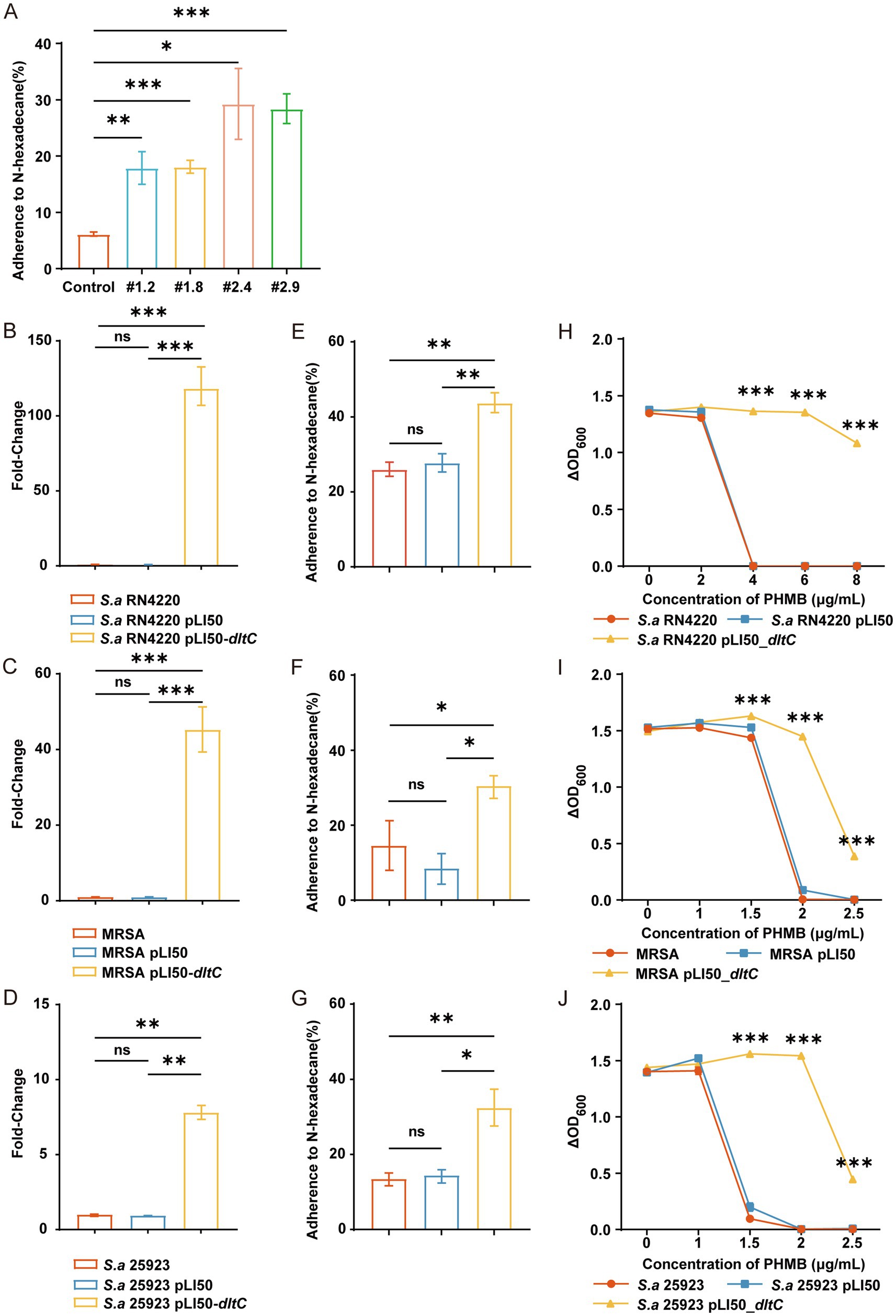 Figure 6. Overexpression of dltC significantly enhances PHMB resistance in S. aureus. (A–C) Introduction of pLI50_dltC into RN4220, MRSA ATCC 43300, and ATCC 25923., and relative quantification of gene expression was performed using the comparative Ct method (2^(-ΔΔCt)). (D–F) PHMB susceptibility assessed by OD600 changes among dltC-overexpressing strains, wild-type, and empty vector controls. (G–I) Bacterial surface hydrophobicity measured in the three backgrounds. (J) Hydrophobicity comparison between MRSA-PR and wild-type. Hydrophobicity was measured based on the adherence of bacteria to n-hexadecane. Data shown as mean ± SD from ≥3 experiments. ns: not significant; *: p < 0.05; **: p < 0.01; ***: p < 0.001.