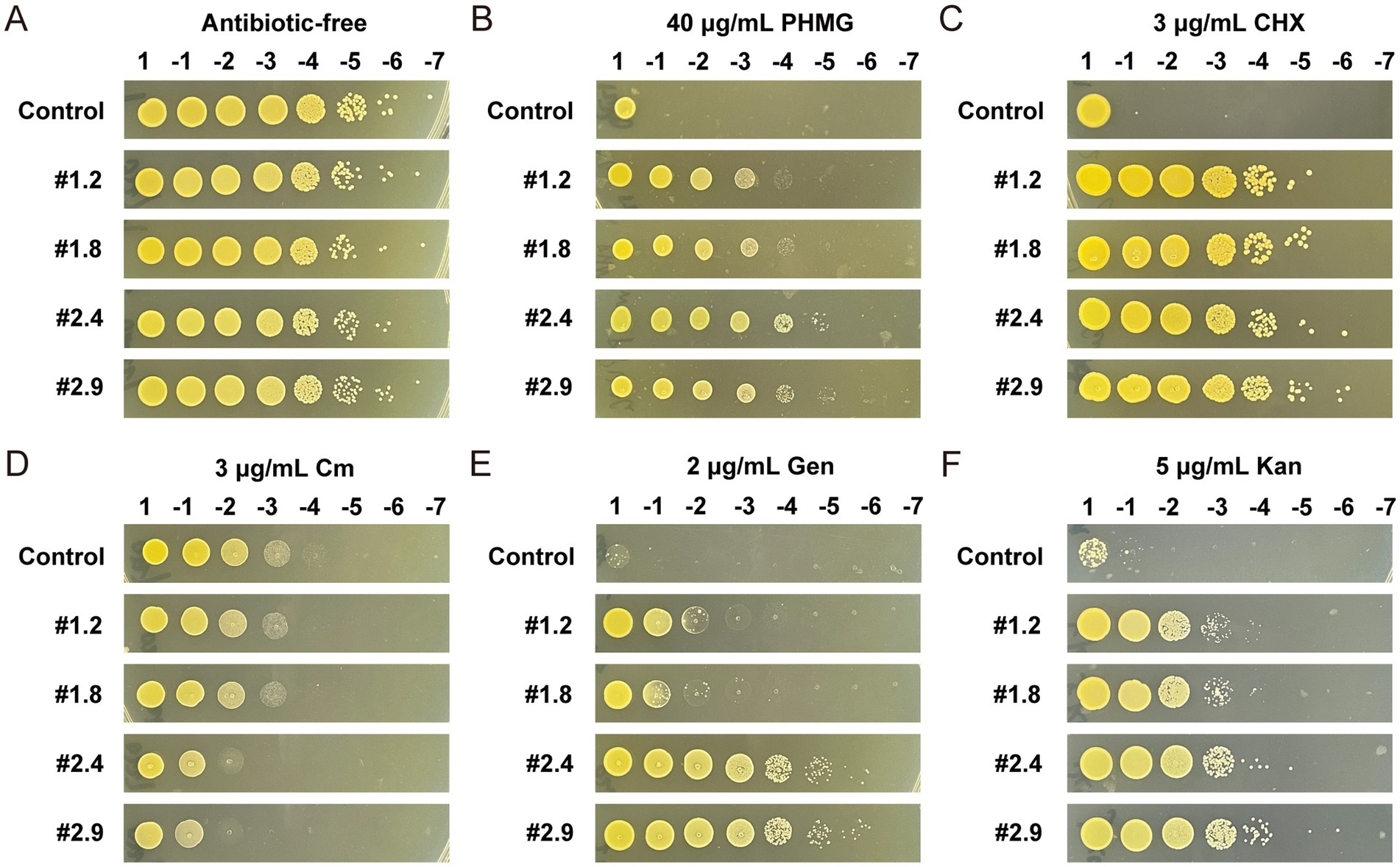 To investigate whether the MRSA-PR strains exhibit similar resistance changes to other antimicrobial agents, MRSA-PR strains were tested against polyhexamethylene guanidine (PHMG), chlorhexidine (CHX), and antibiotics including chloramphenicol (Cm), kanamycin (Kan), and gentamicin (Gen) by spots test. Without antimicrobials, all strains showed good growth (Figure 7A). At 40 μg/mL PHMG, MRSA-PR strains grew at 103–104 dilutions, while the control only grew undiluted (Figure 7B). At 3 μg/mL CHX, the control again grew only undiluted, while MRSA-PR #1.2 and #1.8 grew at 105 dilutions, and #2.4 and #2.9 at 106 (Figure 7C).