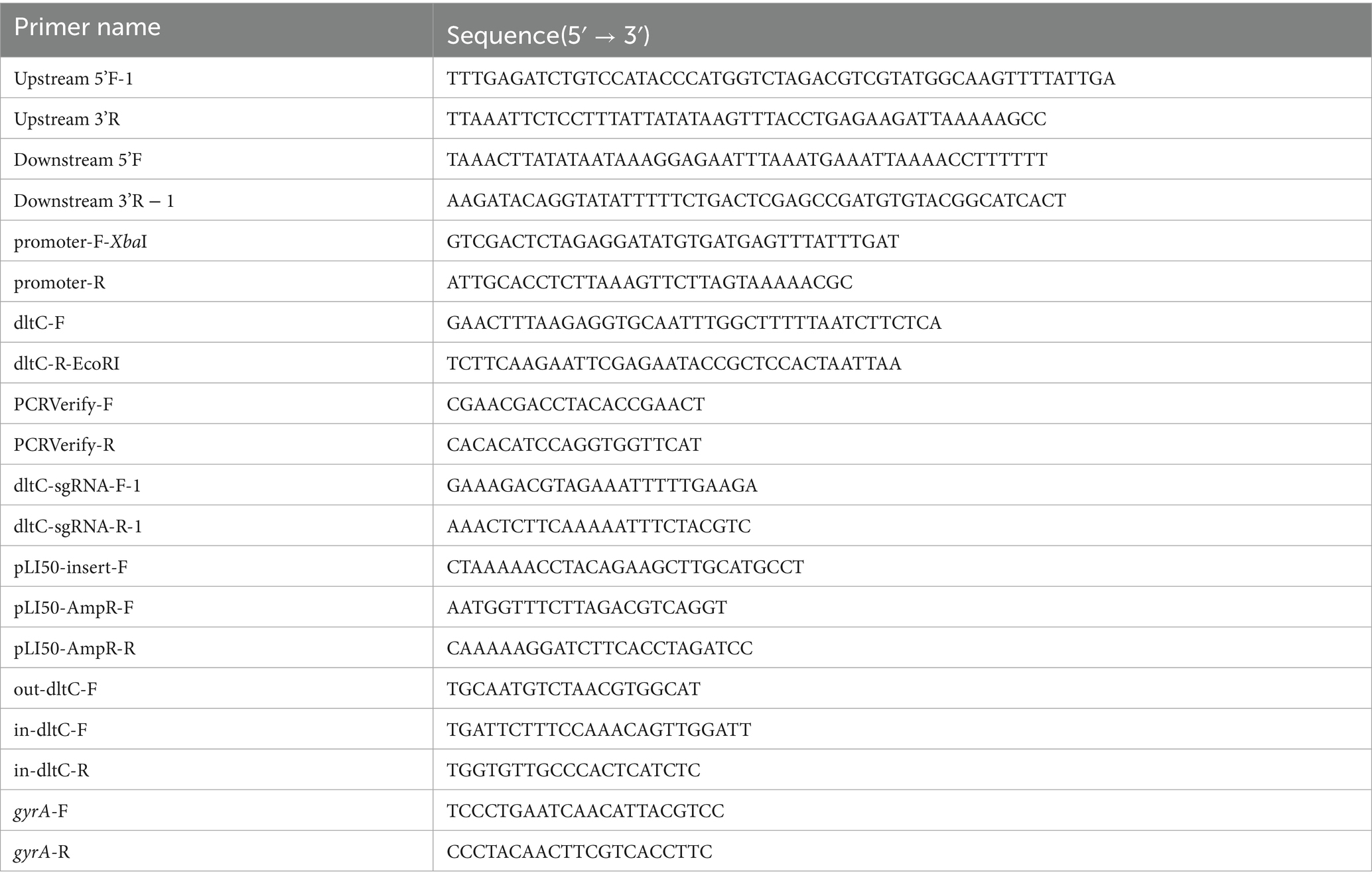 Gene editing was performed according to established protocols for MRSA (Ji, 2020), using the pCasSa plasmid developed by Ji Quanjian’s lab (Chen et al., 2017). The sgRNA spacer sequence targeting dltC was inserted into the pCasSa plasmid using BsaI, yielding pCasSa_dltC_spacer. A ~ 1 kb upstream and downstream homologous arm of dltC was amplified and fused via overlap extension PCR as a repair template, which was inserted into pCasSa_dltC_spacer using XhoI and XbaI to generate the knockout plasmid pCasSa_dltC.